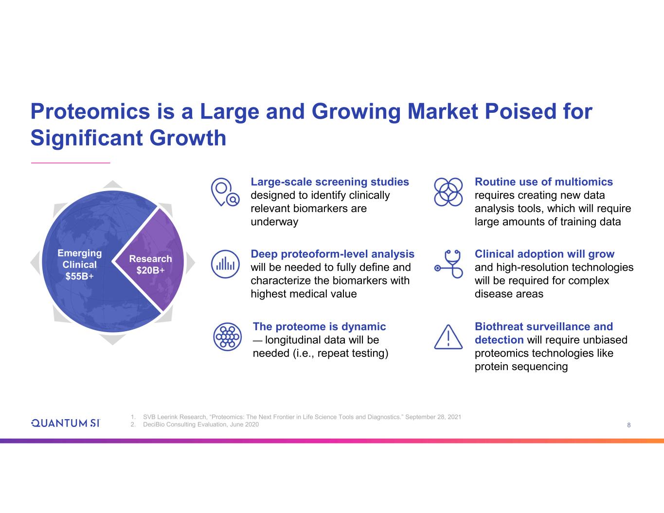 8 Proteomics is a Large and Growing Market Poised for Significant Growth Research $20B+ Emerging Clinical $55B+ Deep proteoform-level analysis will be needed to fully define and characterize the biomarkers with highest medical value Large-scale screening studies designed to identify clinically relevant biomarkers are underway Biothreat surveillance and detection will require unbiased proteomics technologies like protein sequencing Routine use of multiomics requires creating new data analysis tools, which will require large amounts of training data The proteome is dynamic — longitudinal data will be needed (i.e., repeat testing) Clinical adoption will grow and high-resolution technologies will be required for complex disease areas 1. SVB Leerink Research, “Proteomics: The Next Frontier in Life Science Tools and Diagnostics.” September 28, 2021 2. DeciBio Consulting Evaluation, June 2020