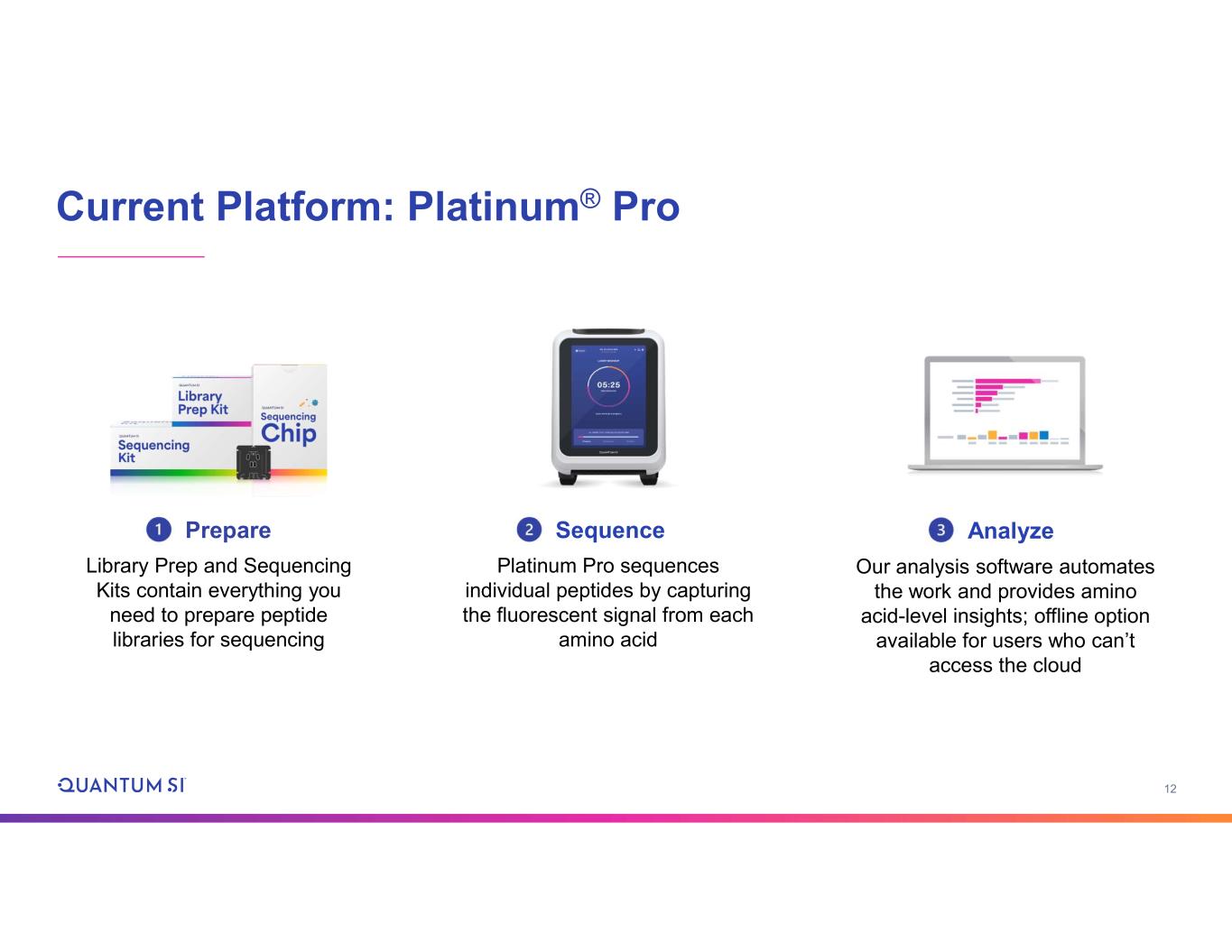12 Current Platform: Platinum® Pro Platinum Pro sequences individual peptides by capturing the fluorescent signal from each amino acid Sequence Analyze Our analysis software automates the work and provides amino acid-level insights; offline option available for users who can’t access the cloud Library Prep and Sequencing Kits contain everything you need to prepare peptide libraries for sequencing Prepare