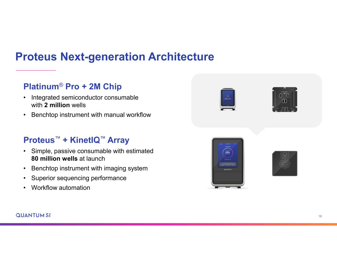 15 Proteus On Track to Far Exceed Platinum Pro at Launch * Proteus is in development. Estimated launch specifications. Switch from semiconductor to optical architecture with patterned nanowell array Liquid handling automation dramatically simplifies workflow 40× more sequencing throughput per consumable relative to Platinum at initial launch* Run up to 4 samples in one sequencing run* Proteus development data is already superior to Platinum, with further improvements expected before launch