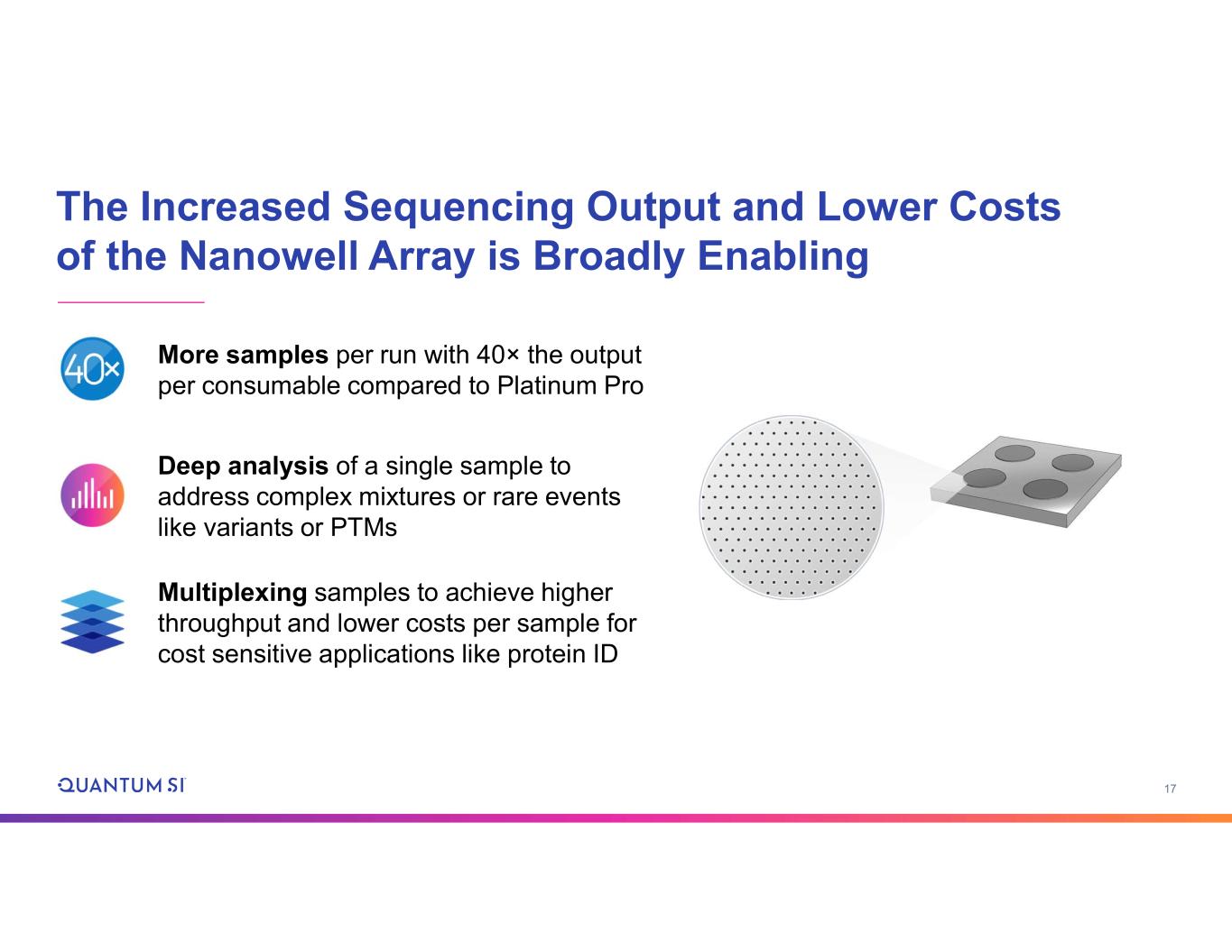 16 Proteus Next-generation Architecture Platinum® Pro + 2M Chip • Integrated semiconductor consumable with 2 million wells • Benchtop instrument with manual workflow Proteus + KinetIQ Array • Simple, passive consumable with estimated 80 million wells at launch • Benchtop instrument with imaging system • Superior sequencing performance • Workflow automation