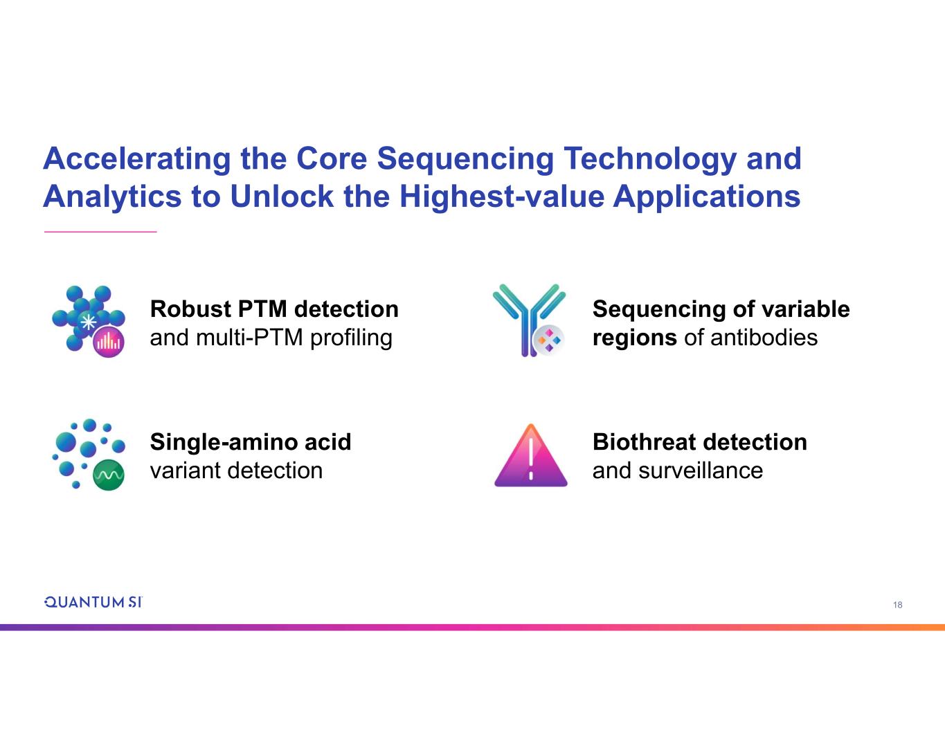 17 The Increased Sequencing Output and Lower Costs of the Nanowell Array is Broadly Enabling More samples per run with 40× the output per consumable compared to Platinum Pro Deep analysis of a single sample to address complex mixtures or rare events like variants or PTMs Multiplexing samples to achieve higher throughput and lower costs per sample for cost sensitive applications like protein ID