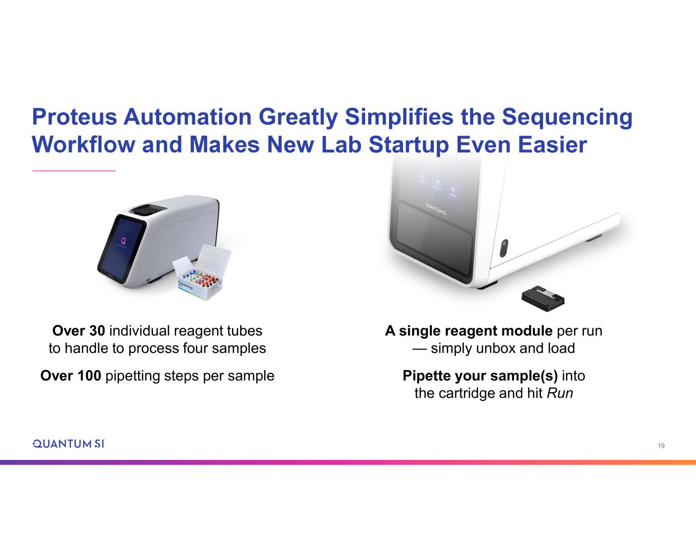 19 Proteus Automation Greatly Simplifies the Sequencing Workflow and Makes New Lab Startup Even Easier A single reagent module per run — simply unbox and load Pipette your sample(s) into the cartridge and hit Run Over 30 individual reagent tubes to handle to process four samples Over 100 pipetting steps per sample