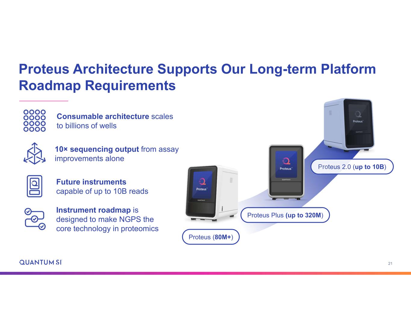 20 Milestones on the Path to Proteus Launch in 2026 External customer collaborations initiated (summer 2026) End-to-end sequencing on fully integrated systems (Q2) Platinum upgrade program released (Q3) Instrument list price released (Q2) Internal V&V (Q4) Sequencing on Proteus prototype Fully integrated systems delivered and operational (Q1) Launch (Q4) 4Q25 1Q26 2Q26 3Q26 4Q26 Demonstration of 20 amino acid detection (Q4) Proteus launch capabilities released (Q3)