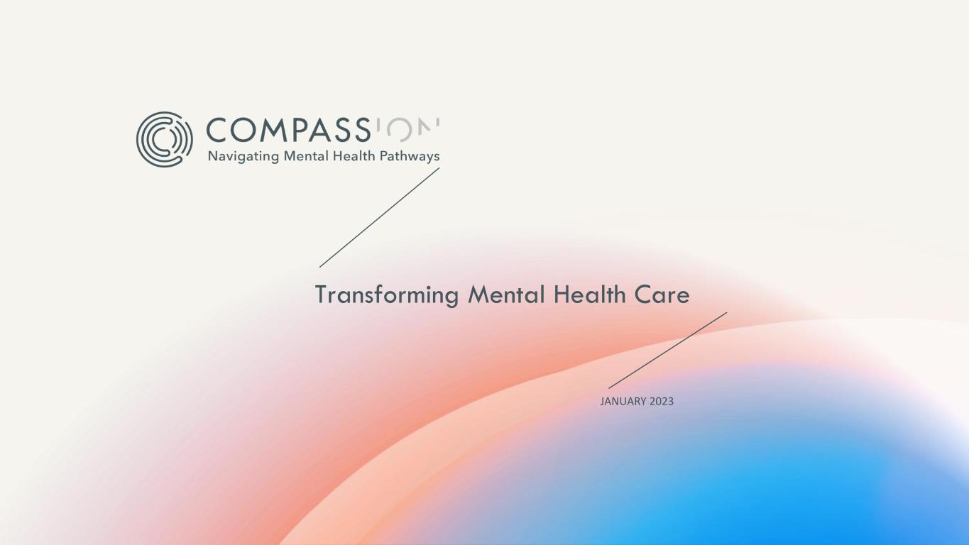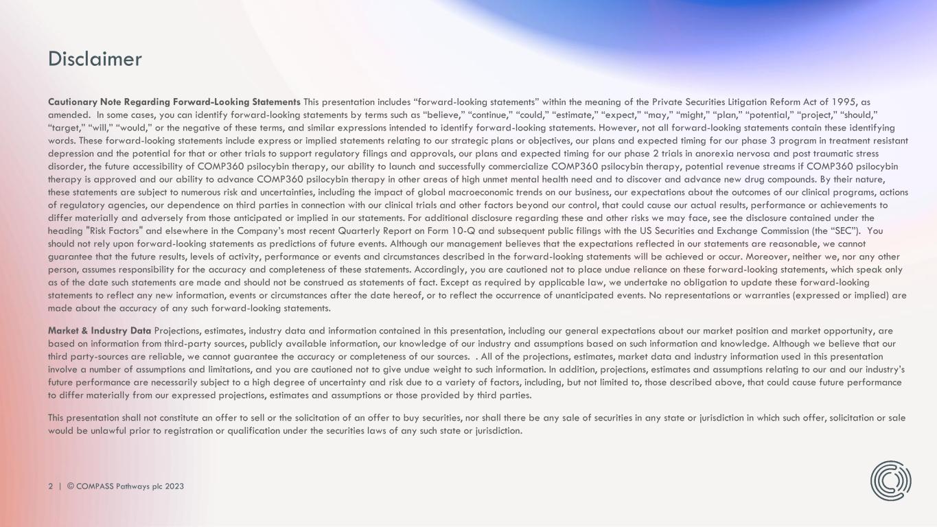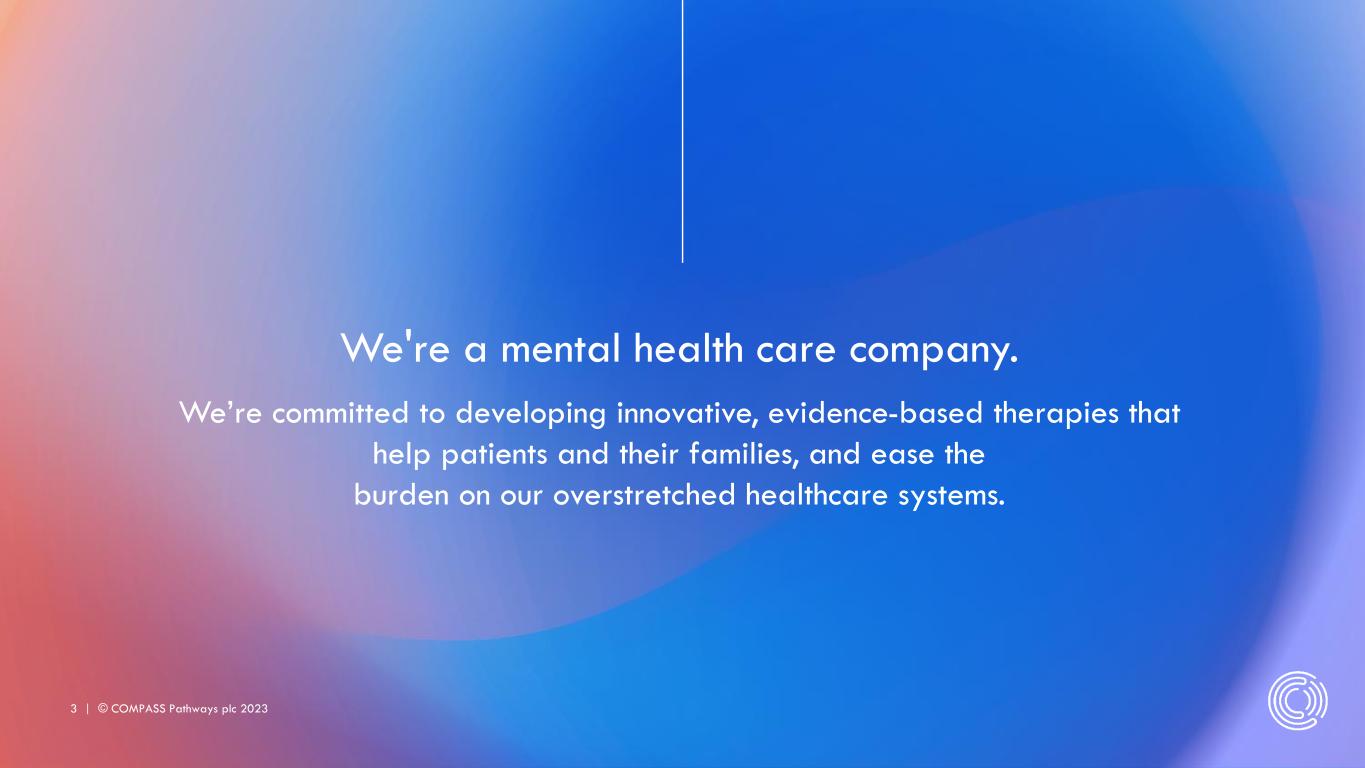 2 | © COMPASS Pathways plc 2023 Cautionary Note Regarding Forward-Looking Statements This presentation includes “forward-looking statements” within the meaning of the Private Securities Litigation Reform Act of 1995, as amended. In some cases, you can identify forward-looking statements by terms such as “believe,” “continue,” “could,” “estimate,” “expect,” “may,” “might,” “plan,” “potential,” “project,” “should,” “target,” “will,” “would,” or the negative of these terms, and similar expressions intended to identify forward-looking statements. However, not all forward-looking statements contain these identifying words. These forward-looking statements include express or implied statements relating to our strategic plans or objectives, our plans and expected timing for our phase 3 program in treatment resistant depression and the potential for that or other trials to support regulatory filings and approvals, our plans and expected timing for our phase 2 trials in anorexia nervosa and post traumatic stress disorder, the future accessibility of COMP360 psilocybin therapy, our ability to launch and successfully commercialize COMP360 psilocybin therapy, potential revenue streams if COMP360 psilocybin therapy is approved and our ability to advance COMP360 psilocybin therapy in other areas of high unmet mental health need and to discover and advance new drug compounds. By their nature, these statements are subject to numerous risk and uncertainties, including the impact of global macroeconomic trends on our business, our expectations about the outcomes of our clinical programs, actions of regulatory agencies, our dependence on third parties in connection with our clinical trials and other factors beyond our control, that could cause our actual results, performance or achievements to differ materially and adversely from those anticipated or implied in our statements. For additional disclosure regarding these and other risks we may face, see the disclosure contained under the heading "Risk Factors" and elsewhere in the Company’s most recent Quarterly Report on Form 10-Q and subsequent public filings with the US Securities and Exchange Commission (the “SEC”). You should not rely upon forward-looking statements as predictions of future events. Although our management believes that the expectations reflected in our statements are reasonable, we cannot guarantee that the future results, levels of activity, performance or events and circumstances described in the forward-looking statements will be achieved or occur. Moreover, neither we, nor any other person, assumes responsibility for the accuracy and completeness of these statements. Accordingly, you are cautioned not to place undue reliance on these forward-looking statements, which speak only as of the date such statements are made and should not be construed as statements of fact. Except as required by applicable law, we undertake no obligation to update these forward-looking statements to reflect any new information, events or circumstances after the date hereof, or to reflect the occurrence of unanticipated events. No representations or warranties (expressed or implied) are made about the accuracy of any such forward-looking statements. Market & Industry Data Projections, estimates, industry data and information contained in this presentation, including our general expectations about our market position and market opportunity, are based on information from third-party sources, publicly available information, our knowledge of our industry and assumptions based on such information and knowledge. Although we believe that our third party-sources are reliable, we cannot guarantee the accuracy or completeness of our sources. . All of the projections, estimates, market data and industry information used in this presentation involve a number of assumptions and limitations, and you are cautioned not to give undue weight to such information. In addition, projections, estimates and assumptions relating to our and our industry’s future performance are necessarily subject to a high degree of uncertainty and risk due to a variety of factors, including, but not limited to, those described above, that could cause future performance to differ materially from our expressed projections, estimates and assumptions or those provided by third parties. This presentation shall not constitute an offer to sell or the solicitation of an offer to buy securities, nor shall there be any sale of securities in any state or jurisdiction in which such offer, solicitation or sale would be unlawful prior to registration or qualification under the securities laws of any such state or jurisdiction. Disclaimer