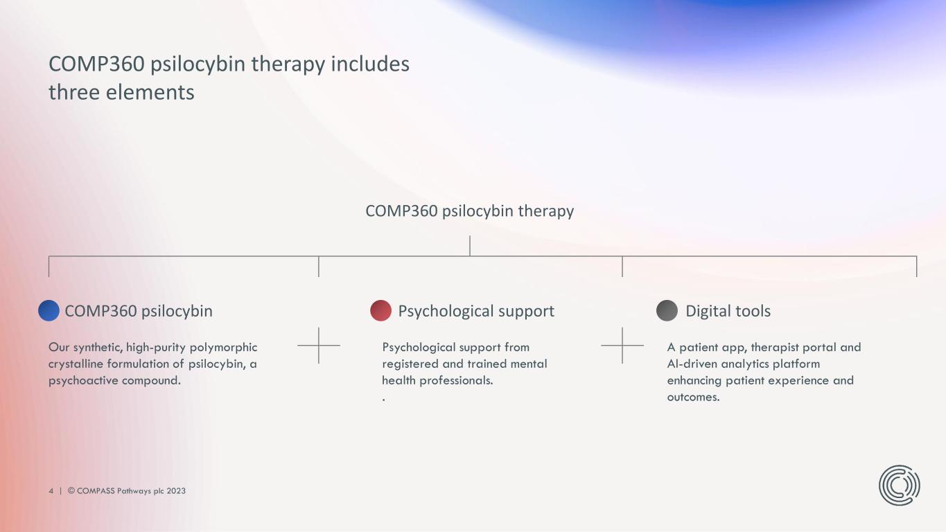 3 | © COMPASS Pathways plc 2023 We're a mental health care company. We’re committed to developing innovative, evidence-based therapies that help patients and their families, and ease the burden on our overstretched healthcare systems.