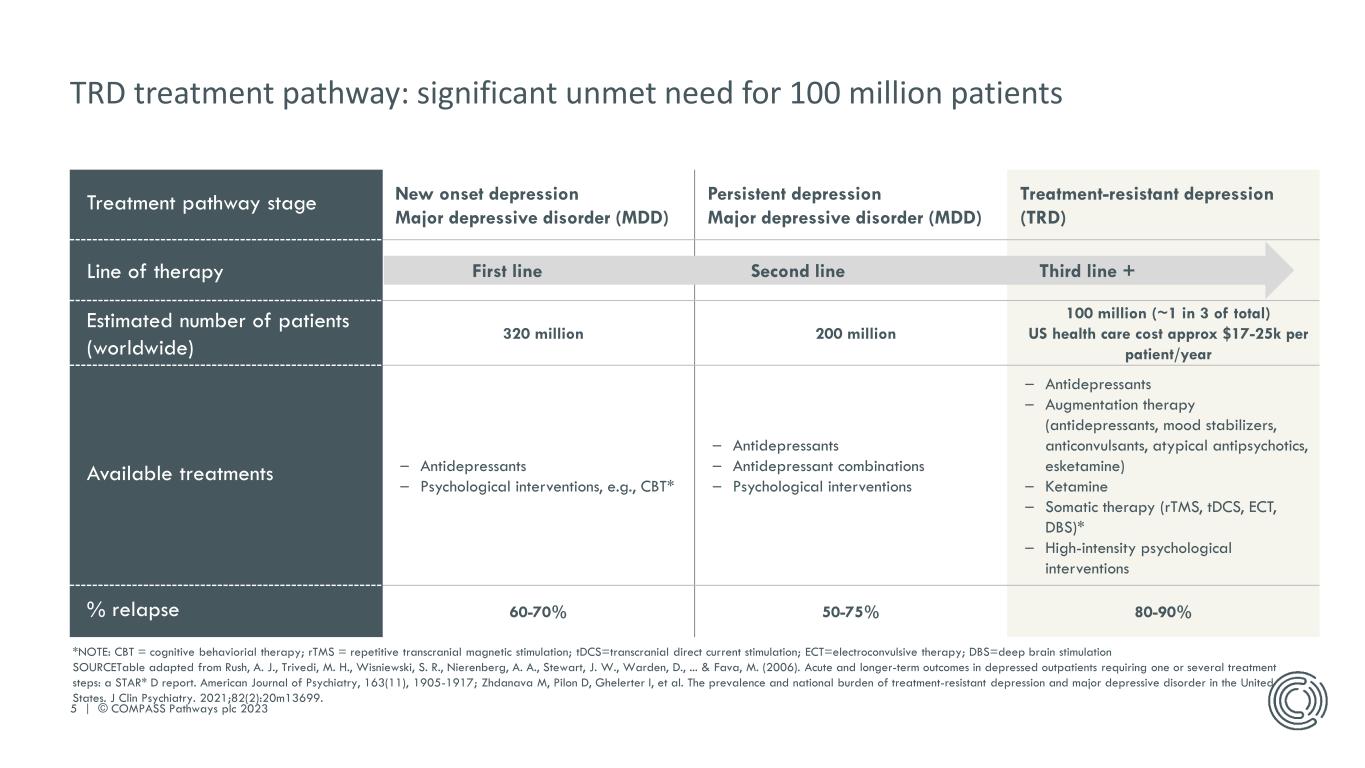 4 | © COMPASS Pathways plc 2023 Our synthetic, high-purity polymorphic crystalline formulation of psilocybin, a psychoactive compound. COMP360 psilocybin therapy includes three elements COMP360 psilocybin Psychological support from registered and trained mental health professionals. . Psychological support A patient app, therapist portal and AI-driven analytics platform enhancing patient experience and outcomes. Digital tools COMP360 psilocybin therapy