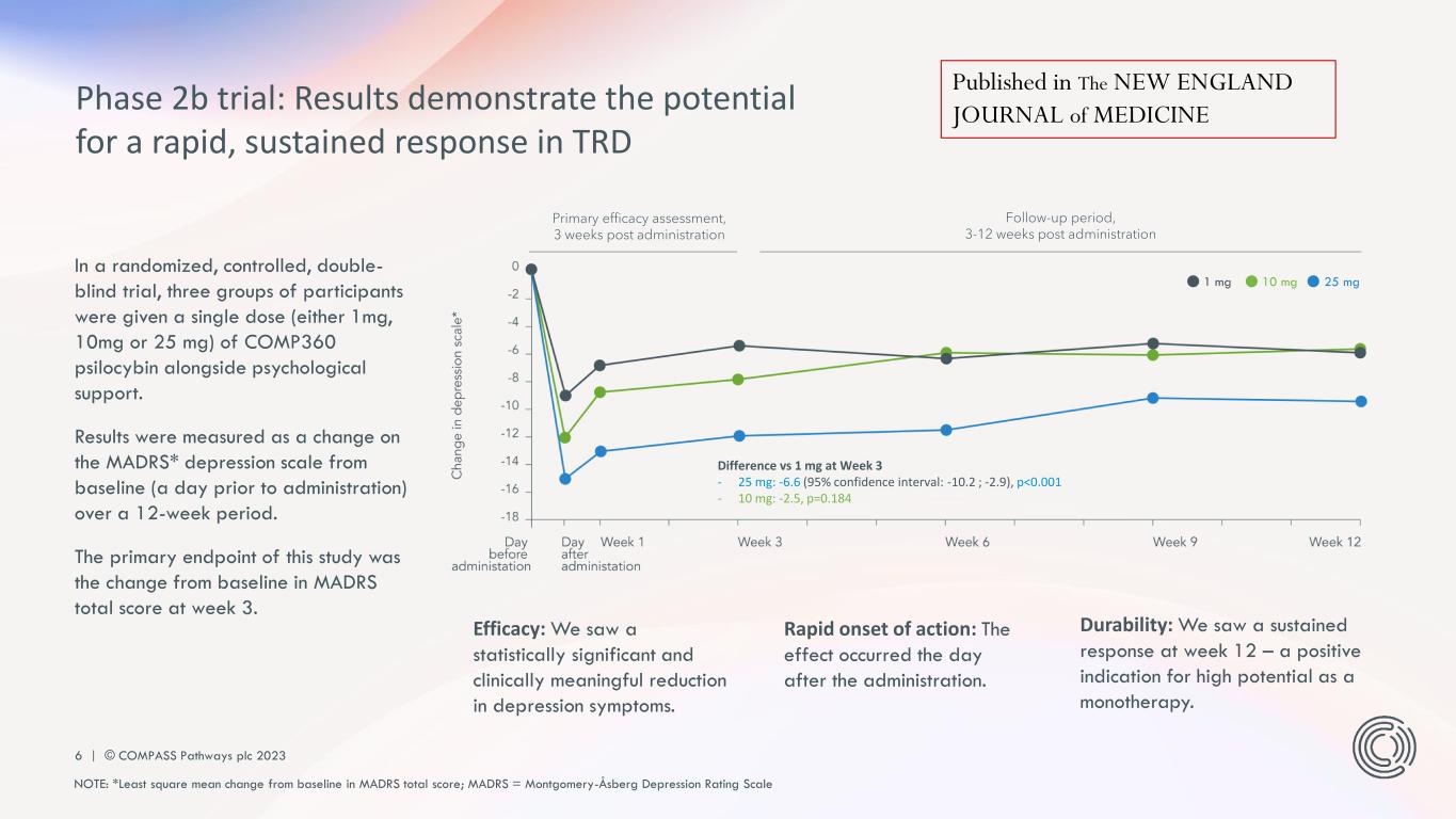PLEASE DO NOT DISTRIBUTE 5 | © COMPASS Pathways plc 2023 TRD treatment pathway: significant unmet need for 100 million patients Treatment pathway stage New onset depression Major depressive disorder (MDD) Persistent depression Major depressive disorder (MDD) Treatment-resistant depression (TRD) Line of therapy Estimated number of patients (worldwide) 320 million 200 million 100 million (~1 in 3 of total) US health care cost approx $17-25k per patient/year Available treatments – Antidepressants – Psychological interventions, e.g., CBT* – Antidepressants – Antidepressant combinations – Psychological interventions – Antidepressants – Augmentation therapy (antidepressants, mood stabilizers, anticonvulsants, atypical antipsychotics, esketamine) – Ketamine – Somatic therapy (rTMS, tDCS, ECT, DBS)* – High-intensity psychological interventions % relapse 60-70% 50-75% 80-90% First line Second line Third line + *NOTE: CBT = cognitive behaviorial therapy; rTMS = repetitive transcranial magnetic stimulation; tDCS=transcranial direct current stimulation; ECT=electroconvulsive therapy; DBS=deep brain stimulation SOURCETable adapted from Rush, A. J., Trivedi, M. H., Wisniewski, S. R., Nierenberg, A. A., Stewart, J. W., Warden, D., ... & Fava, M. (2006). Acute and longer-term outcomes in depressed outpatients requiring one or several treatment steps: a STAR* D report. American Journal of Psychiatry, 163(11), 1905-1917; Zhdanava M, Pilon D, Ghelerter I, et al. The prevalence and national burden of treatment-resistant depression and major depressive disorder in the United States. J Clin Psychiatry. 2021;82(2):20m13699.