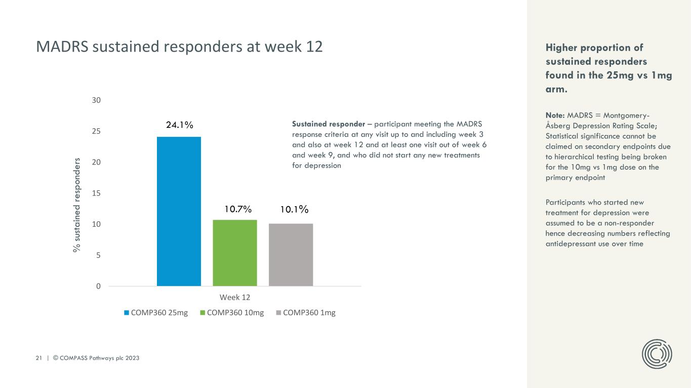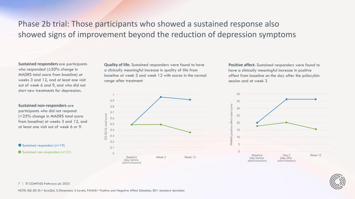 6 | © COMPASS Pathways plc 2023 In a randomized, controlled, double- blind trial, three groups of participants were given a single dose (either 1mg, 10mg or 25 mg) of COMP360 psilocybin alongside psychological support. Results were measured as a change on the MADRS* depression scale from baseline (a day prior to administration) over a 12-week period. The primary endpoint of this study was the change from baseline in MADRS total score at week 3. 1 mg 10 mg 25 mg Rapid onset of action: The effect occurred the day after the administration. Efficacy: We saw a statistically significant and clinically meaningful reduction in depression symptoms. Durability: We saw a sustained response at week 12 – a positive indication for high potential as a monotherapy. Phase 2b trial: Results demonstrate the potential for a rapid, sustained response in TRD NOTE: *Least square mean change from baseline in MADRS total score; MADRS = Montgomery-Åsberg Depression Rating Scale Difference vs 1 mg at Week 3 - 25 mg: -6.6 (95% confidence interval: -10.2 ; -2.9), p<0.001 - 10 mg: -2.5, p=0.184 Primary efficacy assessment, 3 weeks post administration Follow-up period, 3-12 weeks post administration Published in The NEW ENGLAND JOURNAL of MEDICINE