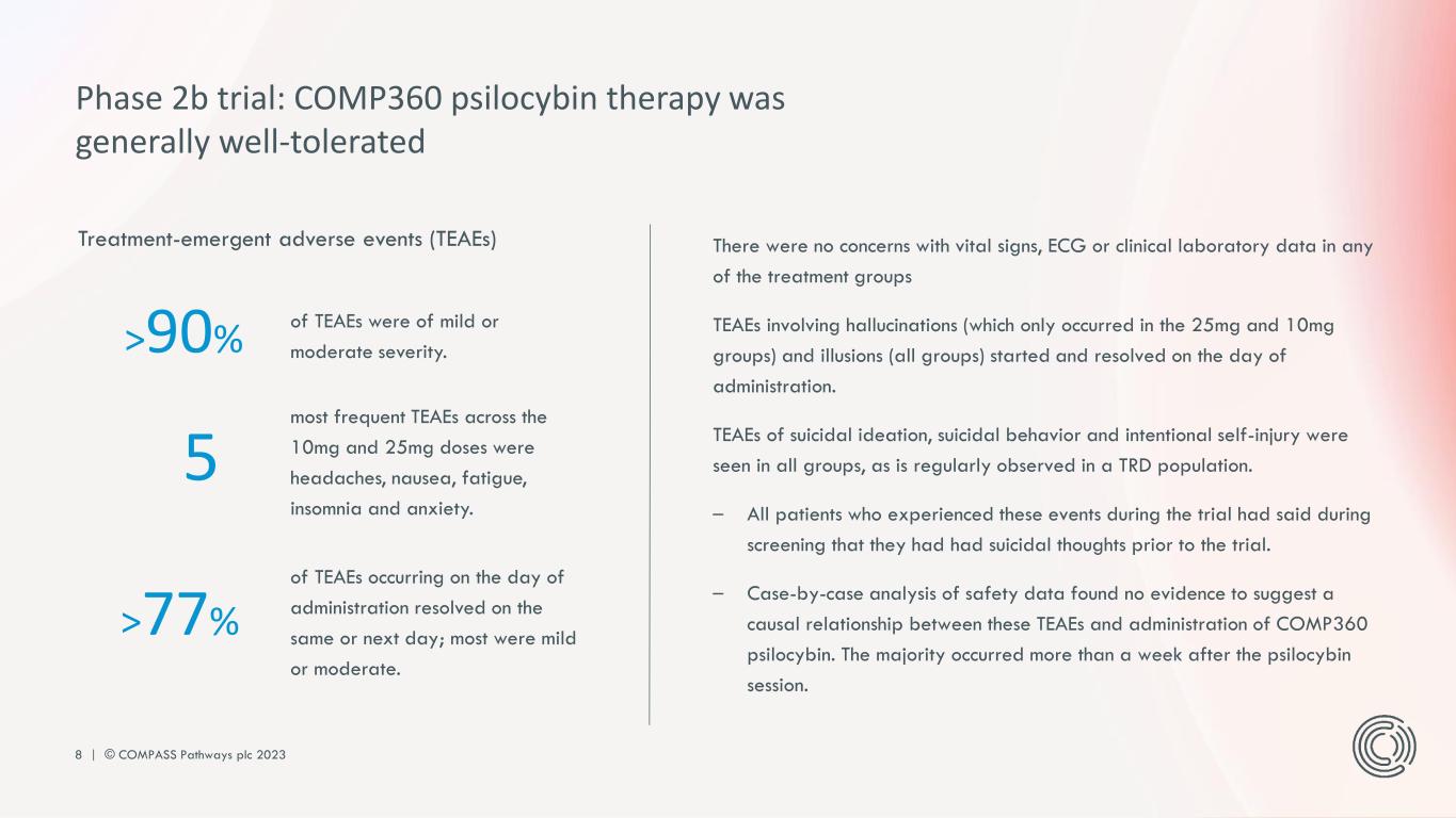 7 | © COMPASS Pathways plc 2023 Sustained responders are participants who responded (≥50% change in MADRS total score from baseline) at weeks 3 and 12, and at least one visit out of week 6 and 9, and who did not start new treatments for depression. Sustained non-responders are participants who did not respond (<25% change in MADRS total score from baseline) at weeks 3 and 12, and at least one visit out of week 6 or 9. Quality of life: Sustained responders were found to have a clinically meaningful increase in quality of life from baseline at week 3 and week 12 with scores in the normal range after treatment Positive affect: Sustained responders were found to have a clinically meaningful increase in positive affect from baseline on the day after the psilocybin session and at week 3 Phase 2b trial: Those participants who showed a sustained response also showed signs of improvement beyond the reduction of depression symptoms NOTE: EQ-5D-3L= EuroQoL 5-Dimensions 3-Levels; PANAS= Positive and Negative Affect Schedule; SD= standard deviation Sustained responders (n=19) Sustained non-responders (n=21)