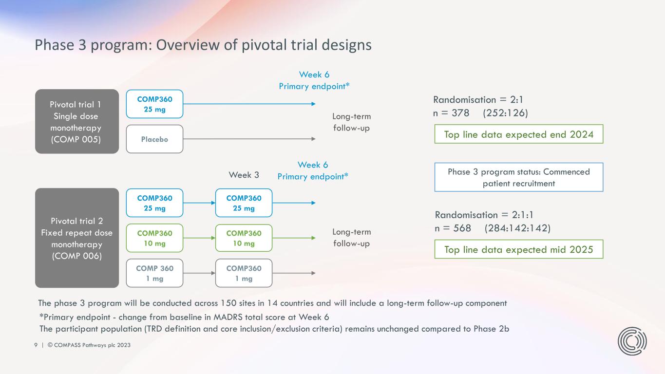 8 | © COMPASS Pathways plc 2023 There were no concerns with vital signs, ECG or clinical laboratory data in any of the treatment groups TEAEs involving hallucinations (which only occurred in the 25mg and 10mg groups) and illusions (all groups) started and resolved on the day of administration. TEAEs of suicidal ideation, suicidal behavior and intentional self-injury were seen in all groups, as is regularly observed in a TRD population. – All patients who experienced these events during the trial had said during screening that they had had suicidal thoughts prior to the trial. – Case-by-case analysis of safety data found no evidence to suggest a causal relationship between these TEAEs and administration of COMP360 psilocybin. The majority occurred more than a week after the psilocybin session. >90% of TEAEs were of mild or moderate severity. 5 most frequent TEAEs across the 10mg and 25mg doses were headaches, nausea, fatigue, insomnia and anxiety. Treatment-emergent adverse events (TEAEs) >77% of TEAEs occurring on the day of administration resolved on the same or next day; most were mild or moderate. Phase 2b trial: COMP360 psilocybin therapy was generally well-tolerated