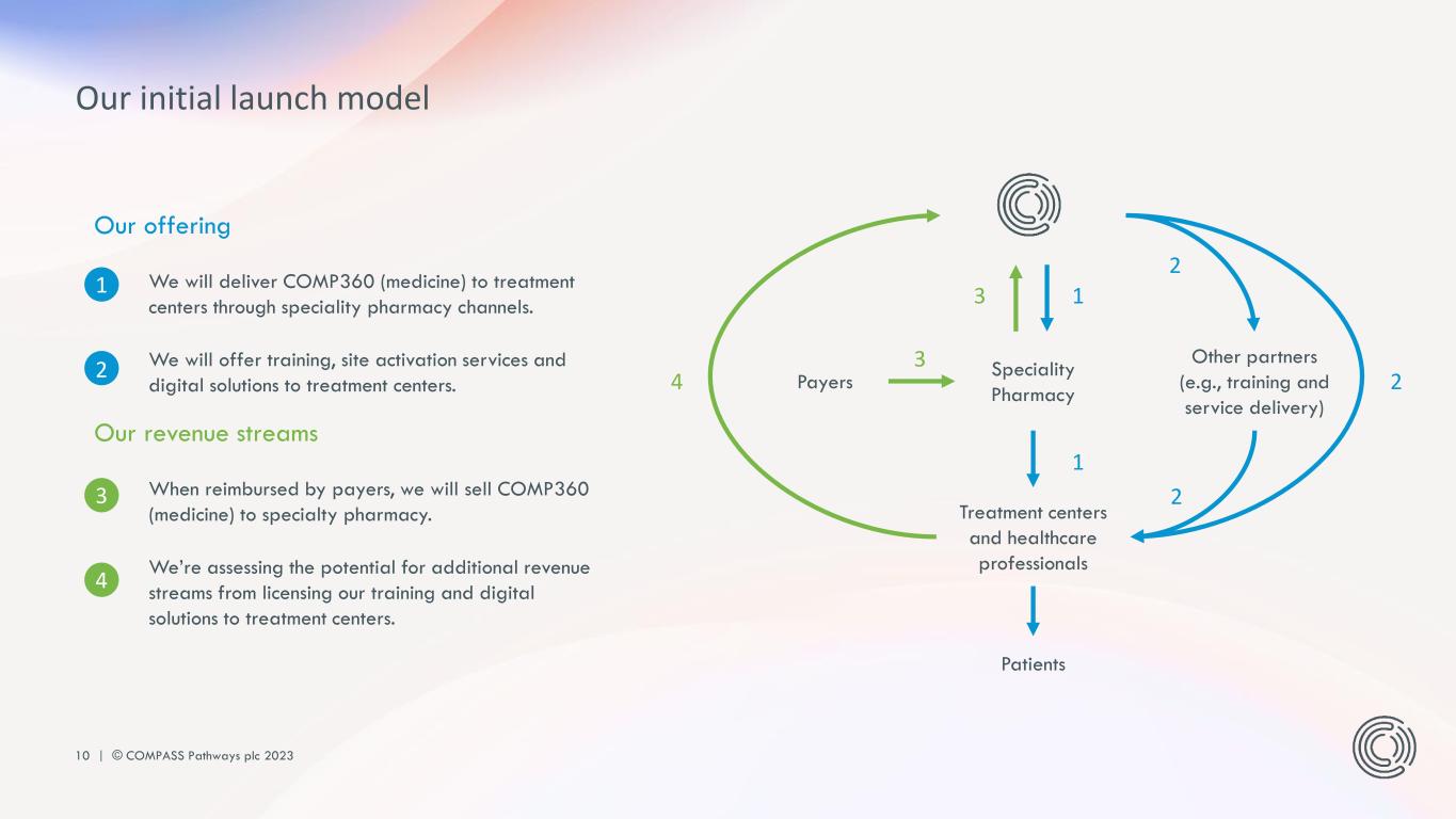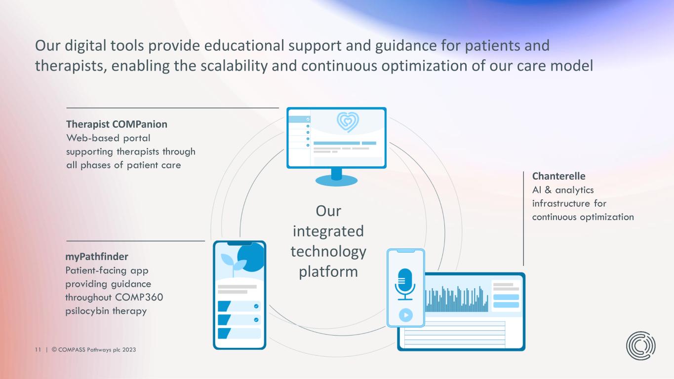 10 | © COMPASS Pathways plc 2023 Our offering We will deliver COMP360 (medicine) to treatment centers through speciality pharmacy channels. We will offer training, site activation services and digital solutions to treatment centers. Our revenue streams When reimbursed by payers, we will sell COMP360 (medicine) to specialty pharmacy. We’re assessing the potential for additional revenue streams from licensing our training and digital solutions to treatment centers. Patients Treatment centers and healthcare professionals Speciality Pharmacy Payers Other partners (e.g., training and service delivery) 1 2 3 4 1 1 2 2 3 3 4 Our initial launch model 2