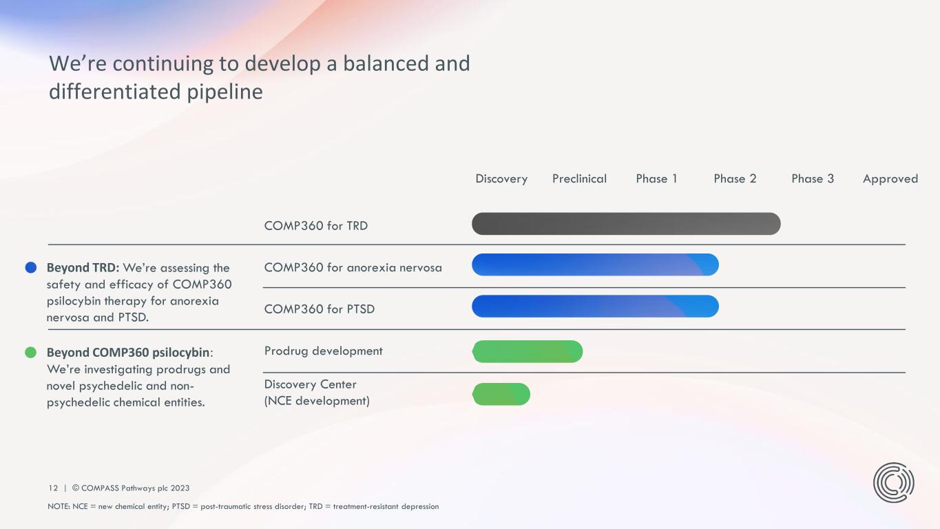 11 | © COMPASS Pathways plc 2023 Therapist COMPanion Web-based portal supporting therapists through all phases of patient care Chanterelle AI & analytics infrastructure for continuous optimization myPathfinder Patient-facing app providing guidance throughout COMP360 psilocybin therapy Our digital tools provide educational support and guidance for patients and therapists, enabling the scalability and continuous optimization of our care model Our integrated technology platform