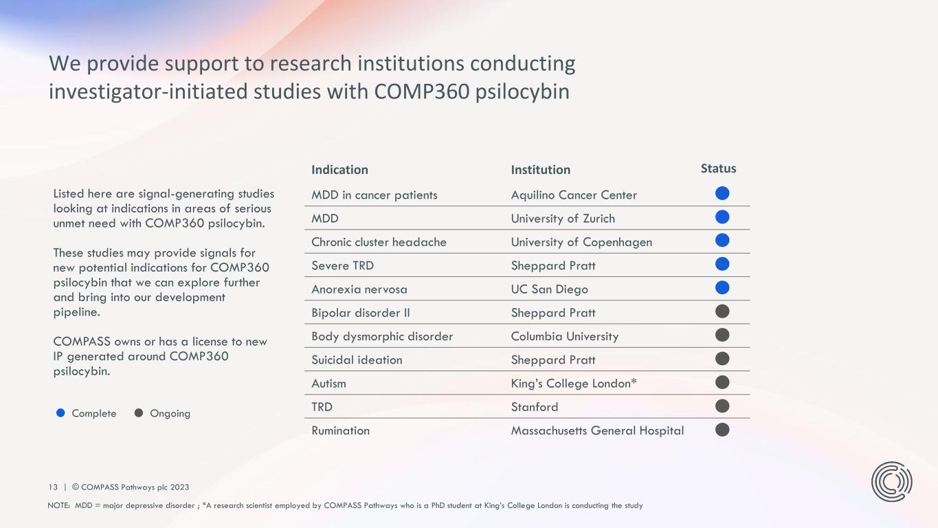 12 | © COMPASS Pathways plc 2023 Discovery Preclinical Phase 1 Phase 2 Phase 3 Approved COMP360 for TRD COMP360 for anorexia nervosa COMP360 for PTSD Prodrug development Discovery Center (NCE development) Beyond COMP360 psilocybin: We’re investigating prodrugs and novel psychedelic and non- psychedelic chemical entities. Beyond TRD: We’re assessing the safety and efficacy of COMP360 psilocybin therapy for anorexia nervosa and PTSD. We’re continuing to develop a balanced and differentiated pipeline NOTE: NCE = new chemical entity; PTSD = post-traumatic stress disorder; TRD = treatment-resistant depression
