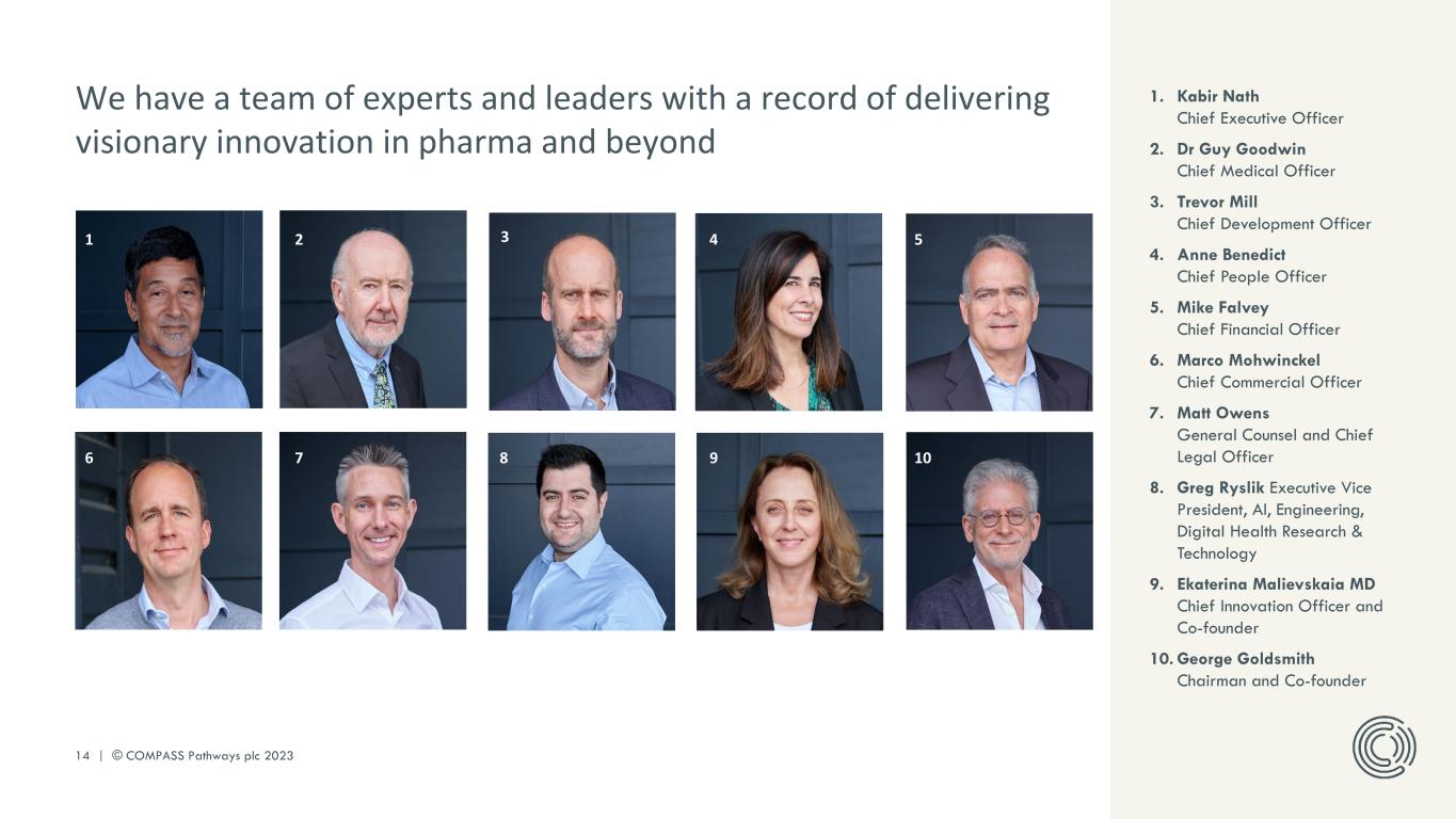 13 | © COMPASS Pathways plc 2023 Listed here are signal-generating studies looking at indications in areas of serious unmet need with COMP360 psilocybin. These studies may provide signals for new potential indications for COMP360 psilocybin that we can explore further and bring into our development pipeline. COMPASS owns or has a license to new IP generated around COMP360 psilocybin. Indication Institution Status MDD in cancer patients Aquilino Cancer Center MDD University of Zurich Chronic cluster headache University of Copenhagen Severe TRD Sheppard Pratt Anorexia nervosa UC San Diego Bipolar disorder II Sheppard Pratt Body dysmorphic disorder Columbia University Suicidal ideation Sheppard Pratt Autism King’s College London* TRD Stanford Rumination Massachusetts General Hospital Complete Ongoing We provide support to research institutions conducting investigator-initiated studies with COMP360 psilocybin NOTE: MDD = major depressive disorder ; *A research scientist employed by COMPASS Pathways who is a PhD student at King’s College London is conducting the study