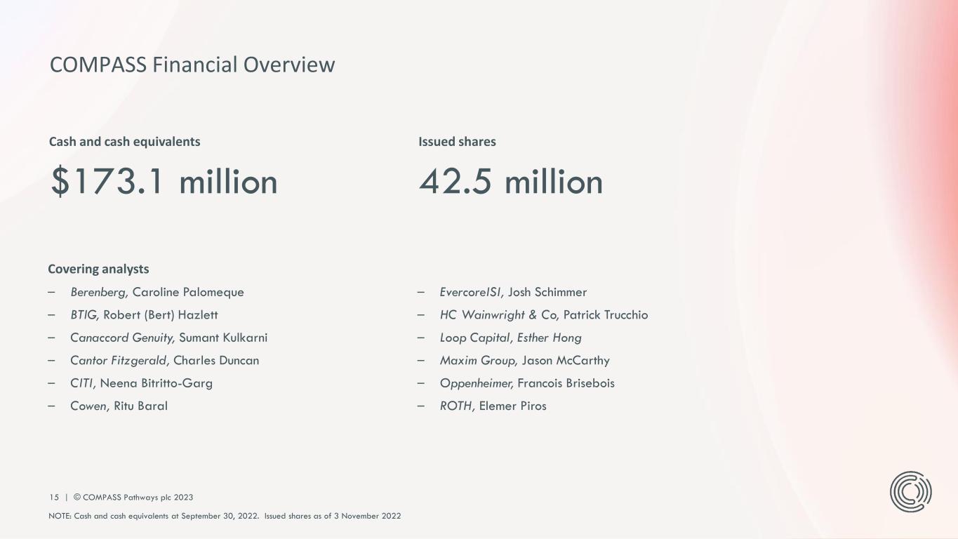 PLEASE DO NOT DISTRIBUTE 14 | © COMPASS Pathways plc 2023 1. Kabir Nath Chief Executive Officer 2. Dr Guy Goodwin Chief Medical Officer 3. Trevor Mill Chief Development Officer 4. Anne Benedict Chief People Officer 5. Mike Falvey Chief Financial Officer 6. Marco Mohwinckel Chief Commercial Officer 7. Matt Owens General Counsel and Chief Legal Officer 8. Greg Ryslik Executive Vice President, AI, Engineering, Digital Health Research & Technology 9. Ekaterina Malievskaia MD Chief Innovation Officer and Co-founder 10. George Goldsmith Chairman and Co-founder 1 2 3 4 5 6 7 8 9 10 We have a team of experts and leaders with a record of delivering visionary innovation in pharma and beyond 3