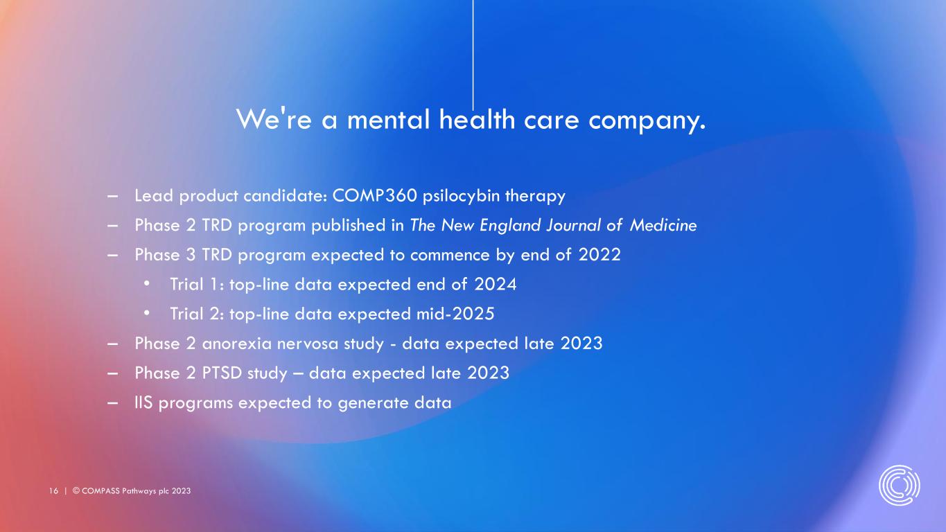 15 | © COMPASS Pathways plc 2023 Cash and cash equivalents $173.1 million Issued shares 42.5 million Covering analysts – Berenberg, Caroline Palomeque – BTIG, Robert (Bert) Hazlett – Canaccord Genuity, Sumant Kulkarni – Cantor Fitzgerald, Charles Duncan – CITI, Neena Bitritto-Garg – Cowen, Ritu Baral – EvercoreISI, Josh Schimmer – HC Wainwright & Co, Patrick Trucchio – Loop Capital, Esther Hong – Maxim Group, Jason McCarthy – Oppenheimer, Francois Brisebois – ROTH, Elemer Piros COMPASS Financial Overview NOTE: Cash and cash equivalents at September 30, 2022. Issued shares as of 3 November 2022