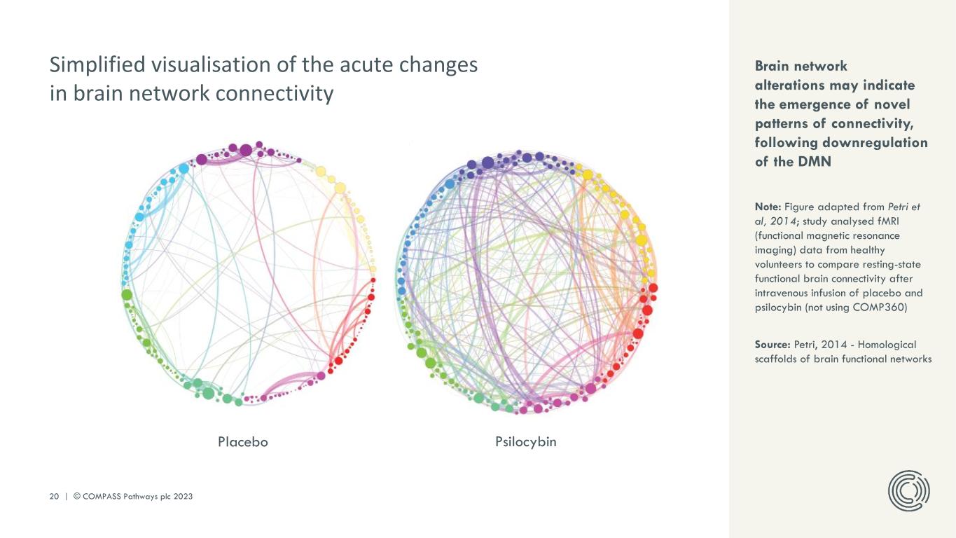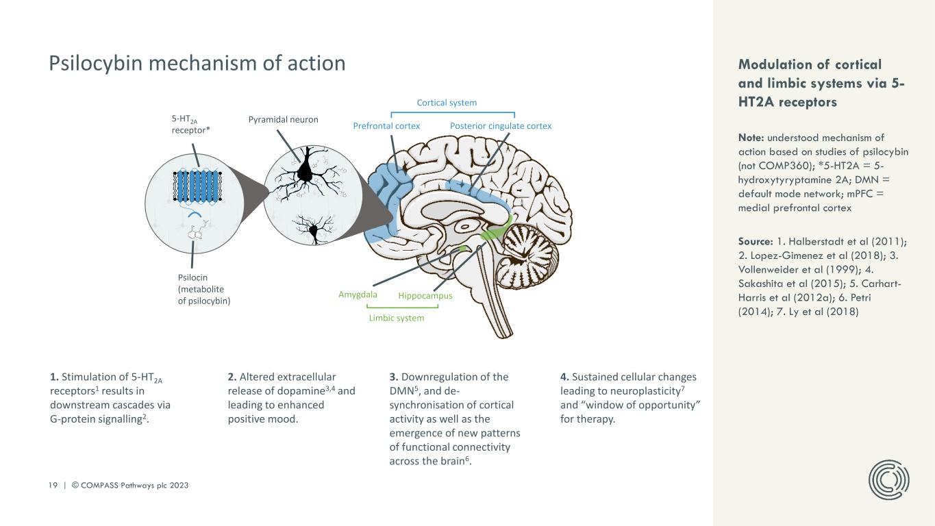 PLEASE DO NOT DISTRIBUTE 19 | © COMPASS Pathways plc 2023 Modulation of cortical and limbic systems via 5- HT2A receptors Note: understood mechanism of action based on studies of psilocybin (not COMP360); *5-HT2A = 5- hydroxytyryptamine 2A; DMN = default mode network; mPFC = medial prefrontal cortex Source: 1. Halberstadt et al (2011); 2. Lopez-Gimenez et al (2018); 3. Vollenweider et al (1999); 4. Sakashita et al (2015); 5. Carhart- Harris et al (2012a); 6. Petri (2014); 7. Ly et al (2018) Prefrontal cortex Posterior cingulate cortex Cortical system Amygdala Hippocampus Limbic system Pyramidal neuron Psilocin (metabolite of psilocybin) 5-HT2A receptor* NH OH N 1. Stimulation of 5-HT2A receptors1 results in downstream cascades via G-protein signalling2. 2. Altered extracellular release of dopamine3,4 and leading to enhanced positive mood. 3. Downregulation of the DMN5, and de- synchronisation of cortical activity as well as the emergence of new patterns of functional connectivity across the brain6. 4. Sustained cellular changes leading to neuroplasticity7 and “window of opportunity” for therapy. Psilocybin mechanism of action