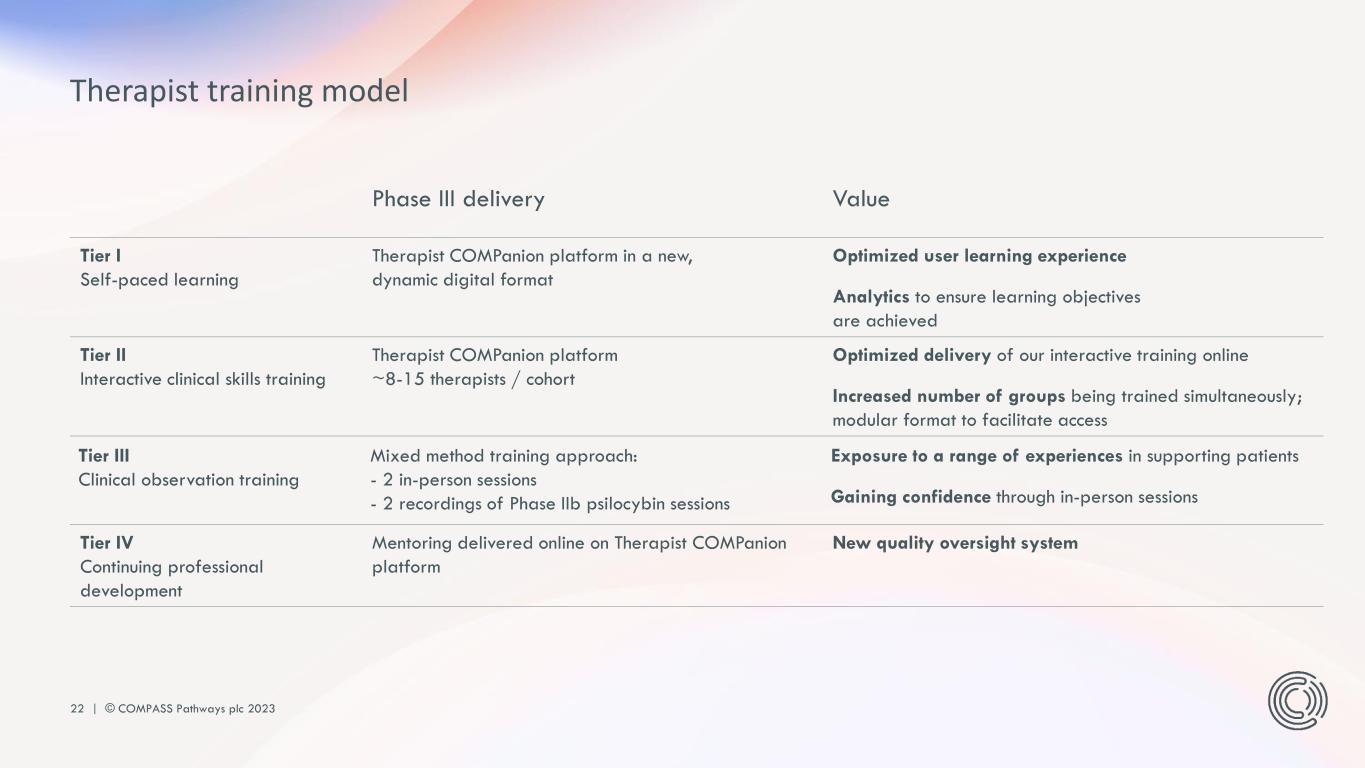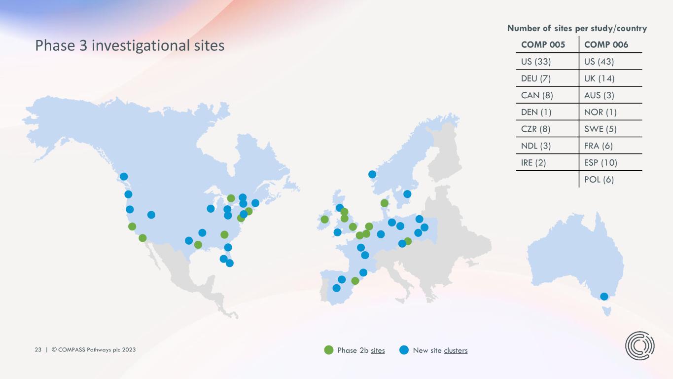 22 | © COMPASS Pathways plc 2023 Therapist training model Phase III delivery Value Tier I Self-paced learning Therapist COMPanion platform in a new, dynamic digital format Optimized user learning experience Analytics to ensure learning objectives are achieved Tier II Interactive clinical skills training Therapist COMPanion platform ~8-15 therapists / cohort Optimized delivery of our interactive training online Increased number of groups being trained simultaneously; modular format to facilitate access Tier III Clinical observation training Mixed method training approach: - 2 in-person sessions - 2 recordings of Phase IIb psilocybin sessions Exposure to a range of experiences in supporting patients Gaining confidence through in-person sessions Tier IV Continuing professional development Mentoring delivered online on Therapist COMPanion platform New quality oversight system