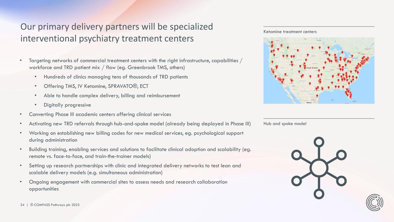 23 | © COMPASS Pathways plc 2023 Phase 3 investigational sites COMP 005 COMP 006 US (33) US (43) DEU (7) UK (14) CAN (8) AUS (3) DEN (1) NOR (1) CZR (8) SWE (5) NDL (3) FRA (6) IRE (2) ESP (10) POL (6) New site clustersPhase 2b sites Number of sites per study/country