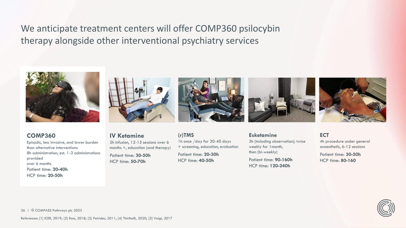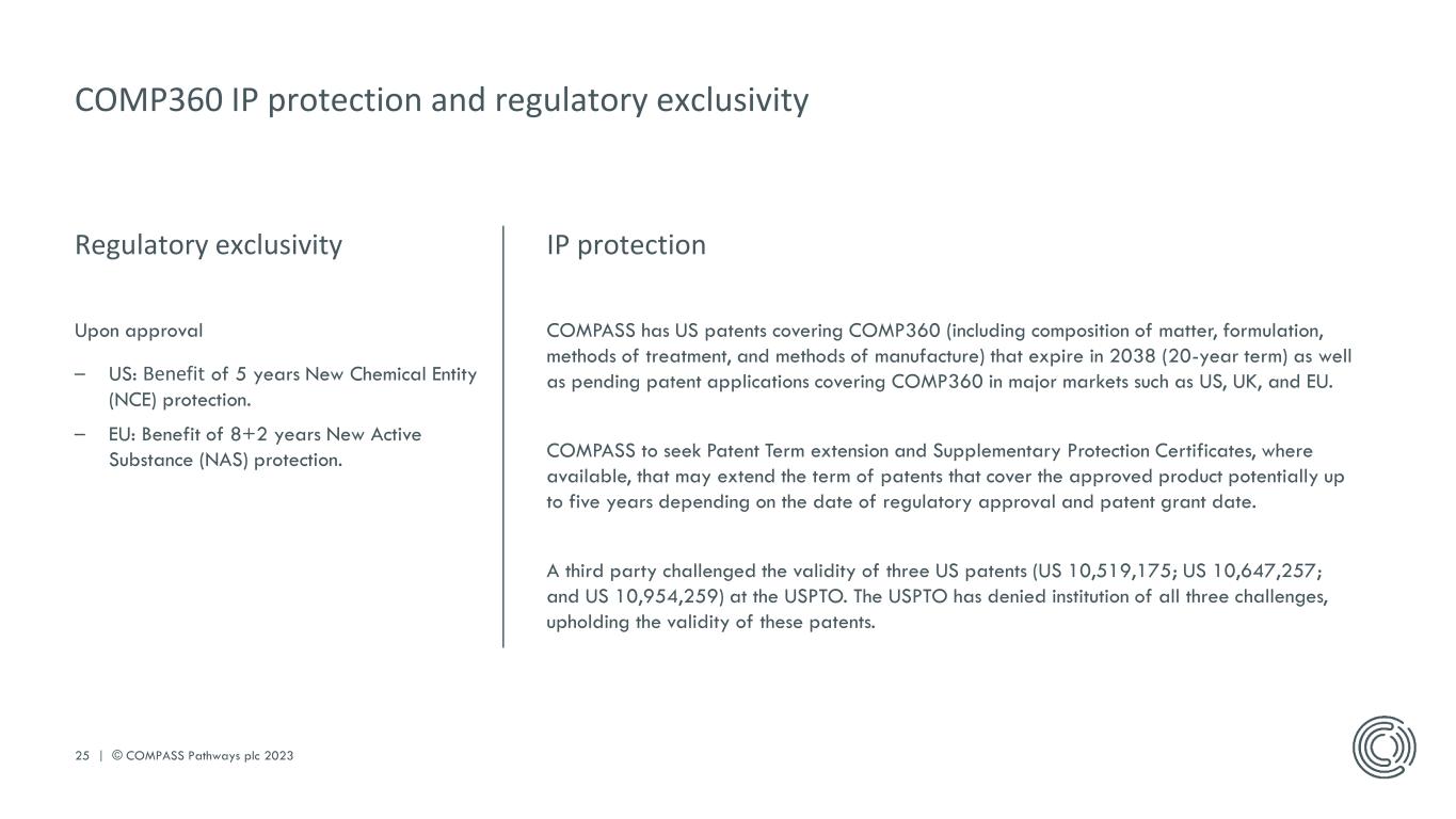 PLEASE DO NOT DISTRIBUTE 25 | © COMPASS Pathways plc 2023 COMP360 IP protection and regulatory exclusivity IP protection COMPASS has US patents covering COMP360 (including composition of matter, formulation, methods of treatment, and methods of manufacture) that expire in 2038 (20-year term) as well as pending patent applications covering COMP360 in major markets such as US, UK, and EU. COMPASS to seek Patent Term extension and Supplementary Protection Certificates, where available, that may extend the term of patents that cover the approved product potentially up to five years depending on the date of regulatory approval and patent grant date. A third party challenged the validity of three US patents (US 10,519,175; US 10,647,257; and US 10,954,259) at the USPTO. The USPTO has denied institution of all three challenges, upholding the validity of these patents. Regulatory exclusivity Upon approval – US: Benefit of 5 years New Chemical Entity (NCE) protection. – EU: Benefit of 8+2 years New Active Substance (NAS) protection.