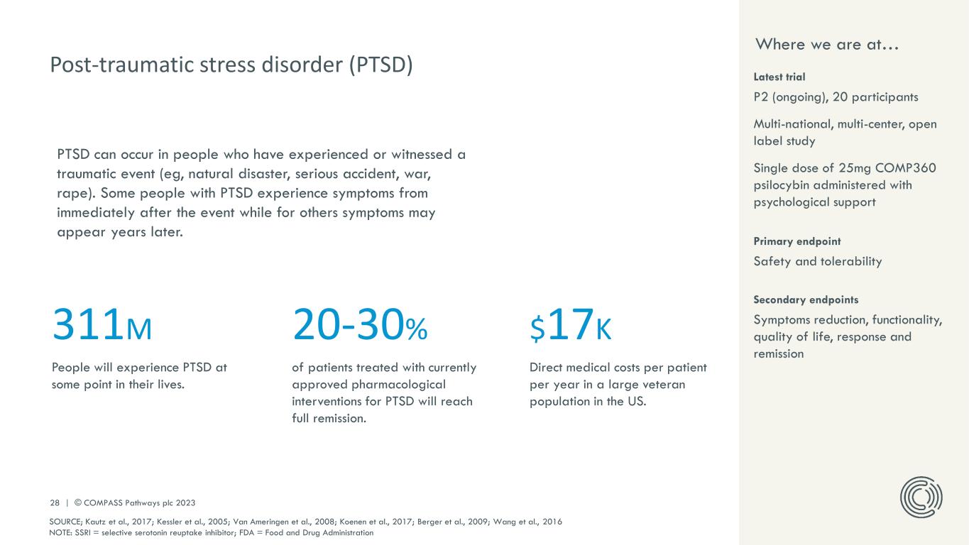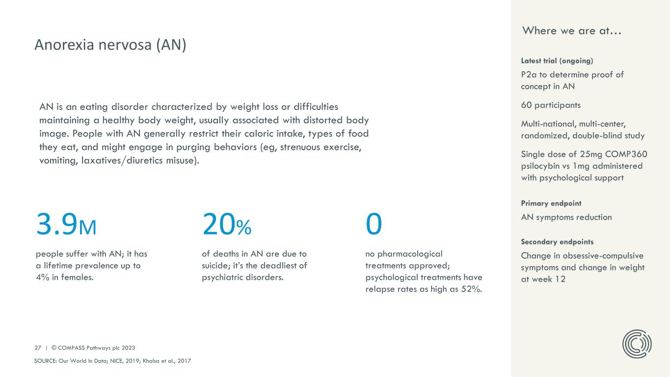 PLEASE DO NOT DISTRIBUTE 27 | © COMPASS Pathways plc 2023 Anorexia nervosa (AN) AN is an eating disorder characterized by weight loss or difficulties maintaining a healthy body weight, usually associated with distorted body image. People with AN generally restrict their caloric intake, types of food they eat, and might engage in purging behaviors (eg, strenuous exercise, vomiting, laxatives/diuretics misuse). 3.9M people suffer with AN; it has a lifetime prevalence up to 4% in females. 20% of deaths in AN are due to suicide; it’s the deadliest of psychiatric disorders. 0 no pharmacological treatments approved; psychological treatments have relapse rates as high as 52%. SOURCE: Our World In Data; NICE, 2019; Khalsa et al., 2017 Where we are at… Secondary endpoints Change in obsessive-compulsive symptoms and change in weight at week 12 Latest trial (ongoing) P2a to determine proof of concept in AN 60 participants Multi-national, multi-center, randomized, double-blind study Single dose of 25mg COMP360 psilocybin vs 1mg administered with psychological support Primary endpoint AN symptoms reduction