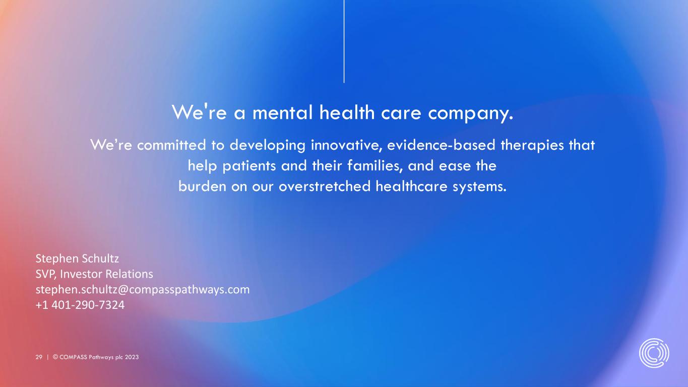 29 | © COMPASS Pathways plc 2023 We're a mental health care company. We’re committed to developing innovative, evidence-based therapies that help patients and their families, and ease the burden on our overstretched healthcare systems. Stephen Schultz SVP, Investor Relations stephen.schultz@compasspathways.com +1 401-290-7324