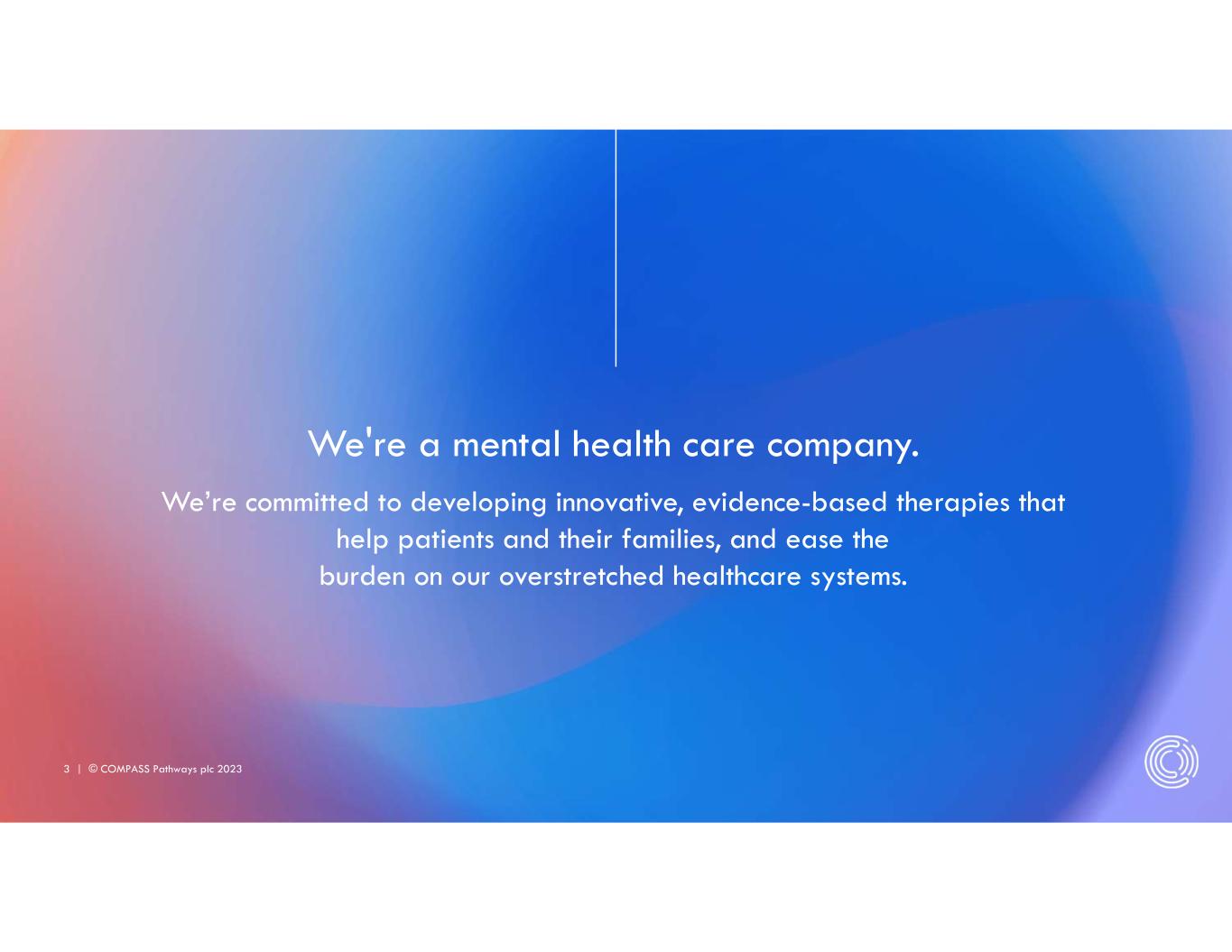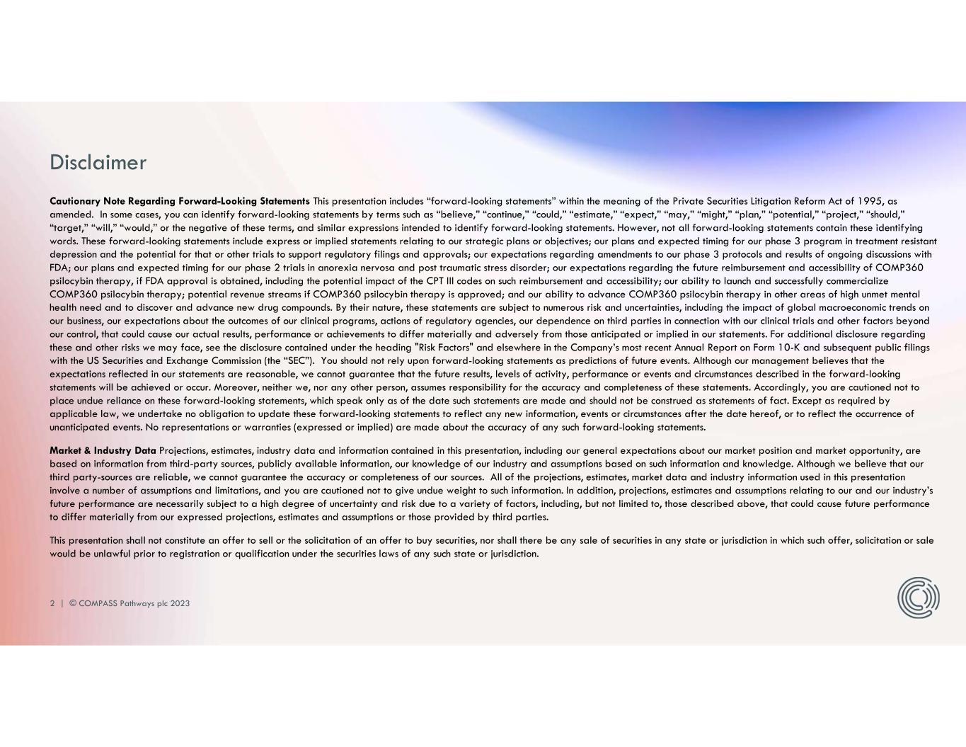 2 | © COMPASS Pathways plc 2023 Cautionary Note Regarding Forward-Looking Statements This presentation includes “forward-looking statements” within the meaning of the Private Securities Litigation Reform Act of 1995, as amended. In some cases, you can identify forward-looking statements by terms such as “believe,” “continue,” “could,” “estimate,” “expect,” “may,” “might,” “plan,” “potential,” “project,” “should,” “target,” “will,” “would,” or the negative of these terms, and similar expressions intended to identify forward-looking statements. However, not all forward-looking statements contain these identifying words. These forward-looking statements include express or implied statements relating to our strategic plans or objectives; our plans and expected timing for our phase 3 program in treatment resistant depression and the potential for that or other trials to support regulatory filings and approvals; our expectations regarding amendments to our phase 3 protocols and results of ongoing discussions with FDA; our plans and expected timing for our phase 2 trials in anorexia nervosa and post traumatic stress disorder; our expectations regarding the future reimbursement and accessibility of COMP360 psilocybin therapy, if FDA approval is obtained, including the potential impact of the CPT III codes on such reimbursement and accessibility; our ability to launch and successfully commercialize COMP360 psilocybin therapy; potential revenue streams if COMP360 psilocybin therapy is approved; and our ability to advance COMP360 psilocybin therapy in other areas of high unmet mental health need and to discover and advance new drug compounds. By their nature, these statements are subject to numerous risk and uncertainties, including the impact of global macroeconomic trends on our business, our expectations about the outcomes of our clinical programs, actions of regulatory agencies, our dependence on third parties in connection with our clinical trials and other factors beyond our control, that could cause our actual results, performance or achievements to differ materially and adversely from those anticipated or implied in our statements. For additional disclosure regarding these and other risks we may face, see the disclosure contained under the heading "Risk Factors" and elsewhere in the Company’s most recent Annual Report on Form 10-K and subsequent public filings with the US Securities and Exchange Commission (the “SEC”). You should not rely upon forward-looking statements as predictions of future events. Although our management believes that the expectations reflected in our statements are reasonable, we cannot guarantee that the future results, levels of activity, performance or events and circumstances described in the forward-looking statements will be achieved or occur. Moreover, neither we, nor any other person, assumes responsibility for the accuracy and completeness of these statements. Accordingly, you are cautioned not to place undue reliance on these forward-looking statements, which speak only as of the date such statements are made and should not be construed as statements of fact. Except as required by applicable law, we undertake no obligation to update these forward-looking statements to reflect any new information, events or circumstances after the date hereof, or to reflect the occurrence of unanticipated events. No representations or warranties (expressed or implied) are made about the accuracy of any such forward-looking statements. Market & Industry Data Projections, estimates, industry data and information contained in this presentation, including our general expectations about our market position and market opportunity, are based on information from third-party sources, publicly available information, our knowledge of our industry and assumptions based on such information and knowledge. Although we believe that our third party-sources are reliable, we cannot guarantee the accuracy or completeness of our sources. All of the projections, estimates, market data and industry information used in this presentation involve a number of assumptions and limitations, and you are cautioned not to give undue weight to such information. In addition, projections, estimates and assumptions relating to our and our industry’s future performance are necessarily subject to a high degree of uncertainty and risk due to a variety of factors, including, but not limited to, those described above, that could cause future performance to differ materially from our expressed projections, estimates and assumptions or those provided by third parties. This presentation shall not constitute an offer to sell or the solicitation of an offer to buy securities, nor shall there be any sale of securities in any state or jurisdiction in which such offer, solicitation or sale would be unlawful prior to registration or qualification under the securities laws of any such state or jurisdiction. Disclaimer