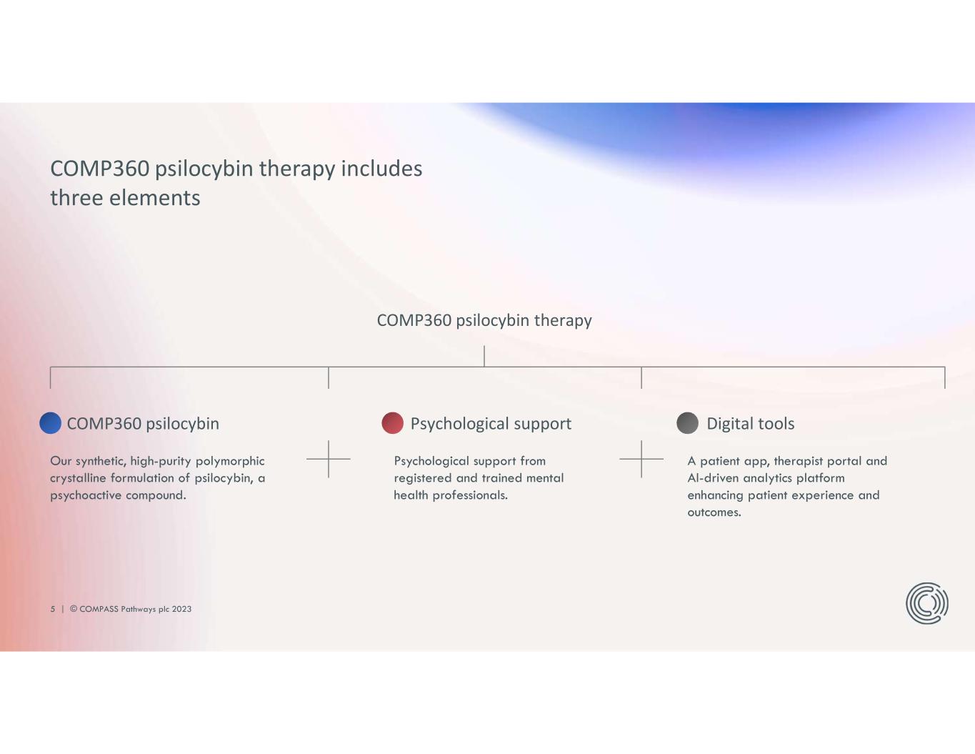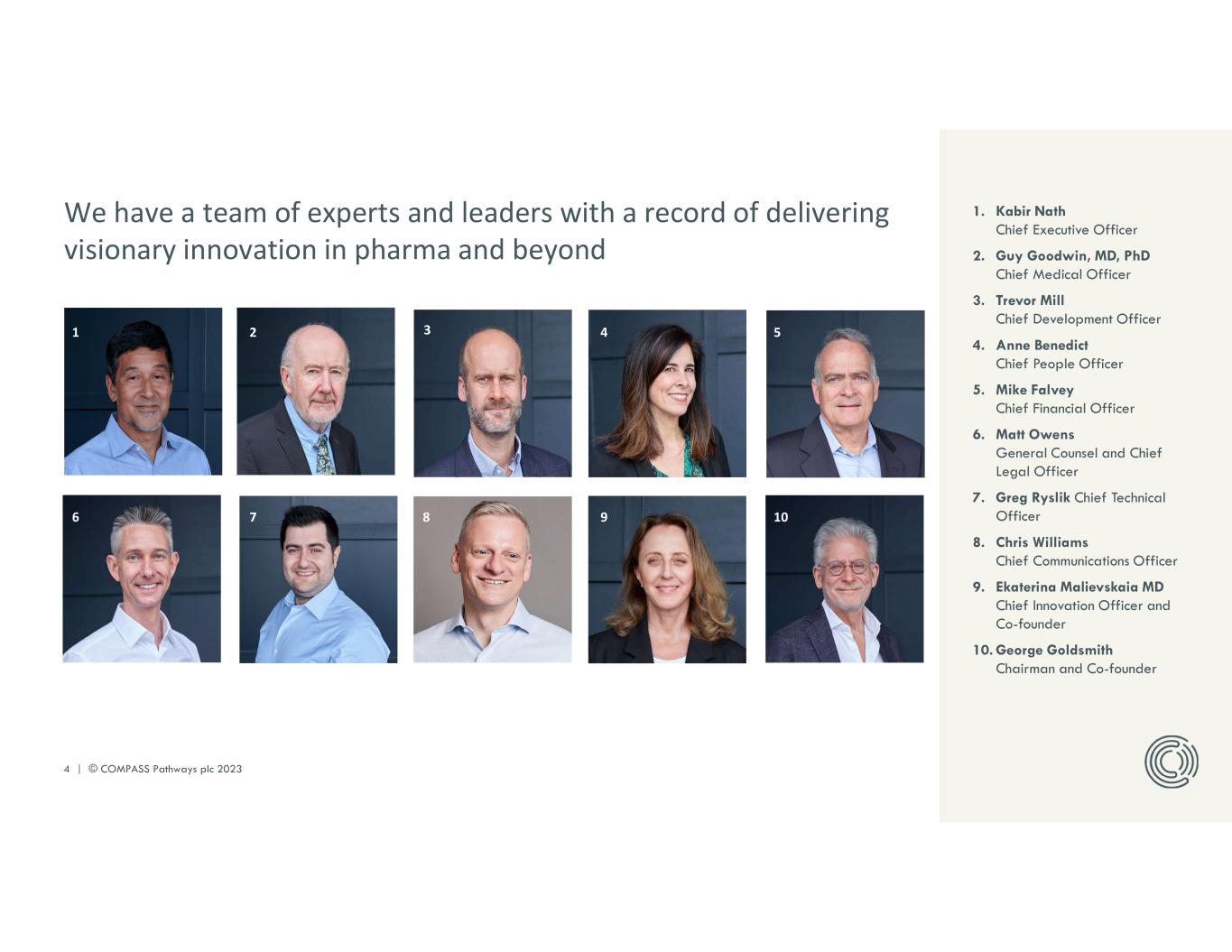 3 | © COMPASS Pathways plc 2023 We're a mental health care company. We’re committed to developing innovative, evidence-based therapies that help patients and their families, and ease the burden on our overstretched healthcare systems.
