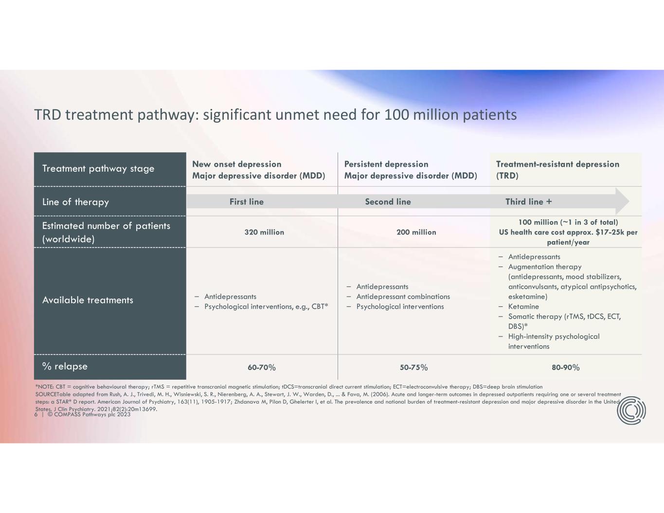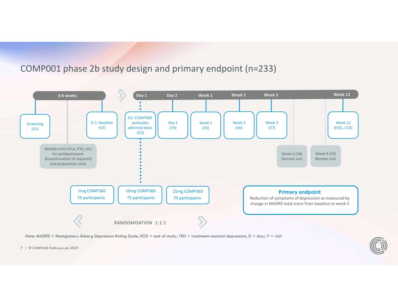 6 | © COMPASS Pathways plc 2023 TRD treatment pathway: significant unmet need for 100 million patients Treatment pathway stage New onset depression Major depressive disorder (MDD) Persistent depression Major depressive disorder (MDD) Treatment-resistant depression (TRD) Line of therapy Estimated number of patients (worldwide) 320 million 200 million 100 million (~1 in 3 of total) US health care cost approx. $17-25k per patient/year Available treatments – Antidepressants – Psychological interventions, e.g., CBT* – Antidepressants – Antidepressant combinations – Psychological interventions – Antidepressants – Augmentation therapy (antidepressants, mood stabilizers, anticonvulsants, atypical antipsychotics, esketamine) – Ketamine – Somatic therapy (rTMS, tDCS, ECT, DBS)* – High-intensity psychological interventions % relapse 60-70% 50-75% 80-90% First line Second line Third line + *NOTE: CBT = cognitive behavioural therapy; rTMS = repetitive transcranial magnetic stimulation; tDCS=transcranial direct current stimulation; ECT=electroconvulsive therapy; DBS=deep brain stimulation SOURCETable adapted from Rush, A. J., Trivedi, M. H., Wisniewski, S. R., Nierenberg, A. A., Stewart, J. W., Warden, D., ... & Fava, M. (2006). Acute and longer-term outcomes in depressed outpatients requiring one or several treatment steps: a STAR* D report. American Journal of Psychiatry, 163(11), 1905-1917; Zhdanava M, Pilon D, Ghelerter I, et al. The prevalence and national burden of treatment-resistant depression and major depressive disorder in the United States. J Clin Psychiatry. 2021;82(2):20m13699.