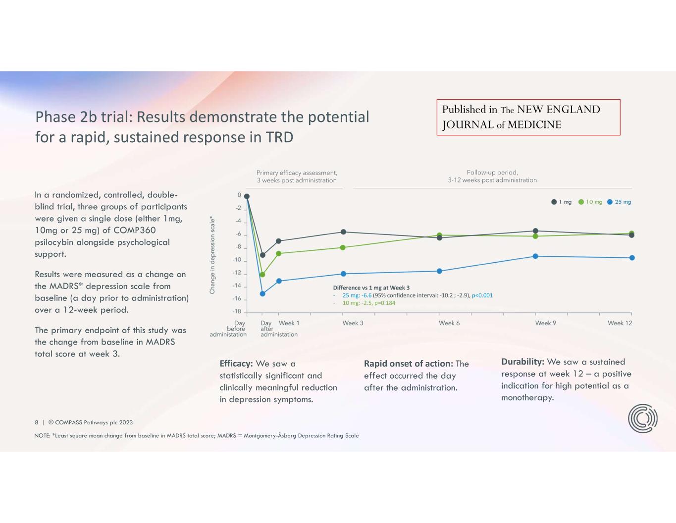7 | © COMPASS Pathways plc 2023 COMP001 phase 2b study design and primary endpoint (n=233) Primary endpoint Reduction of symptoms of depression as measured by change in MADRS total score from baseline to week 3 Weekly visits (V1a, V1b, etc) for antidepressant discontinuation (if required) and preparation visits Screening (V1) D-1: Baseline (V2) Day 2 (V4) Week 3 (V7) Week 12 (EOS., V10) D1: COMP360 psilocybin administration (V3) RANDOMISATION 1:1:1 3-6 weeks Day 1 Day 2 Week 6 (V8) Remote visit Week 9 (V9) Remote visit Week 12 Week 1 (V5) Week 2 (V6) Week 1 Week 2 79 participants 75 participants 79 participants 25mg COMP36010mg COMP3601mg COMP360 Note: MADRS = Montgomery-Åsberg Depression Rating Scale; EOS = end of study; TRD = treatment-resistant depression; D = day; V = visit Week 3