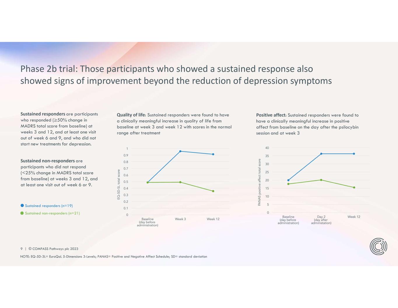 8 | © COMPASS Pathways plc 2023 In a randomized, controlled, double- blind trial, three groups of participants were given a single dose (either 1mg, 10mg or 25 mg) of COMP360 psilocybin alongside psychological support. Results were measured as a change on the MADRS* depression scale from baseline (a day prior to administration) over a 12-week period. The primary endpoint of this study was the change from baseline in MADRS total score at week 3. 1 mg 10 mg 25 mg Rapid onset of action: The effect occurred the day after the administration. Efficacy: We saw a statistically significant and clinically meaningful reduction in depression symptoms. Durability: We saw a sustained response at week 12 – a positive indication for high potential as a monotherapy. Phase 2b trial: Results demonstrate the potential for a rapid, sustained response in TRD NOTE: *Least square mean change from baseline in MADRS total score; MADRS = Montgomery-Åsberg Depression Rating Scale Difference vs 1 mg at Week 3 - 25 mg: -6.6 (95% confidence interval: -10.2 ; -2.9), p<0.001 - 10 mg: -2.5, p=0.184 Primary efficacy assessment, 3 weeks post administration Follow-up period, 3-12 weeks post administration Published in The NEW ENGLAND JOURNAL of MEDICINE