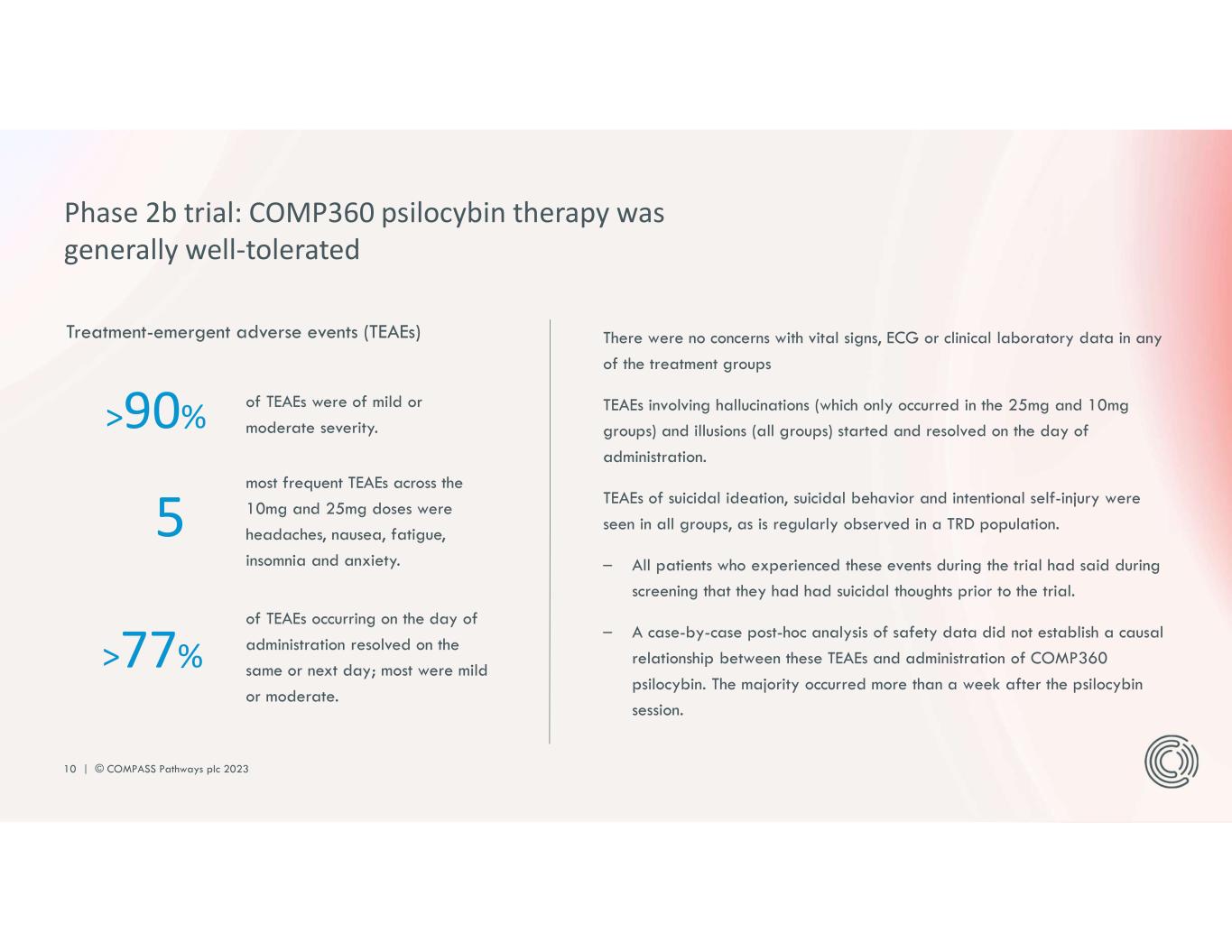 9 | © COMPASS Pathways plc 2023 Sustained responders are participants who responded (≥50% change in MADRS total score from baseline) at weeks 3 and 12, and at least one visit out of week 6 and 9, and who did not start new treatments for depression. Sustained non-responders are participants who did not respond (<25% change in MADRS total score from baseline) at weeks 3 and 12, and at least one visit out of week 6 or 9. Quality of life: Sustained responders were found to have a clinically meaningful increase in quality of life from baseline at week 3 and week 12 with scores in the normal range after treatment Positive affect: Sustained responders were found to have a clinically meaningful increase in positive affect from baseline on the day after the psilocybin session and at week 3 Phase 2b trial: Those participants who showed a sustained response also showed signs of improvement beyond the reduction of depression symptoms NOTE: EQ-5D-3L= EuroQoL 5-Dimensions 3-Levels; PANAS= Positive and Negative Affect Schedule; SD= standard deviation Sustained responders (n=19) Sustained non-responders (n=21)
