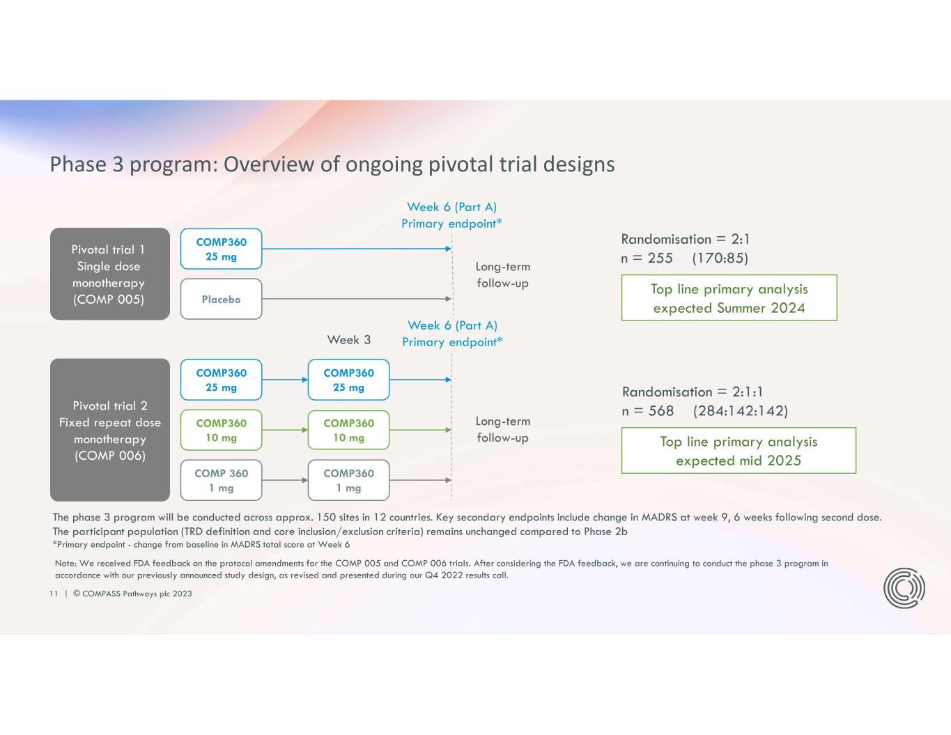 10 | © COMPASS Pathways plc 2023 There were no concerns with vital signs, ECG or clinical laboratory data in any of the treatment groups TEAEs involving hallucinations (which only occurred in the 25mg and 10mg groups) and illusions (all groups) started and resolved on the day of administration. TEAEs of suicidal ideation, suicidal behavior and intentional self-injury were seen in all groups, as is regularly observed in a TRD population. – All patients who experienced these events during the trial had said during screening that they had had suicidal thoughts prior to the trial. – A case-by-case post-hoc analysis of safety data did not establish a causal relationship between these TEAEs and administration of COMP360 psilocybin. The majority occurred more than a week after the psilocybin session. >90% of TEAEs were of mild or moderate severity. 5 most frequent TEAEs across the 10mg and 25mg doses were headaches, nausea, fatigue, insomnia and anxiety. Treatment-emergent adverse events (TEAEs) >77% of TEAEs occurring on the day of administration resolved on the same or next day; most were mild or moderate. Phase 2b trial: COMP360 psilocybin therapy was generally well-tolerated