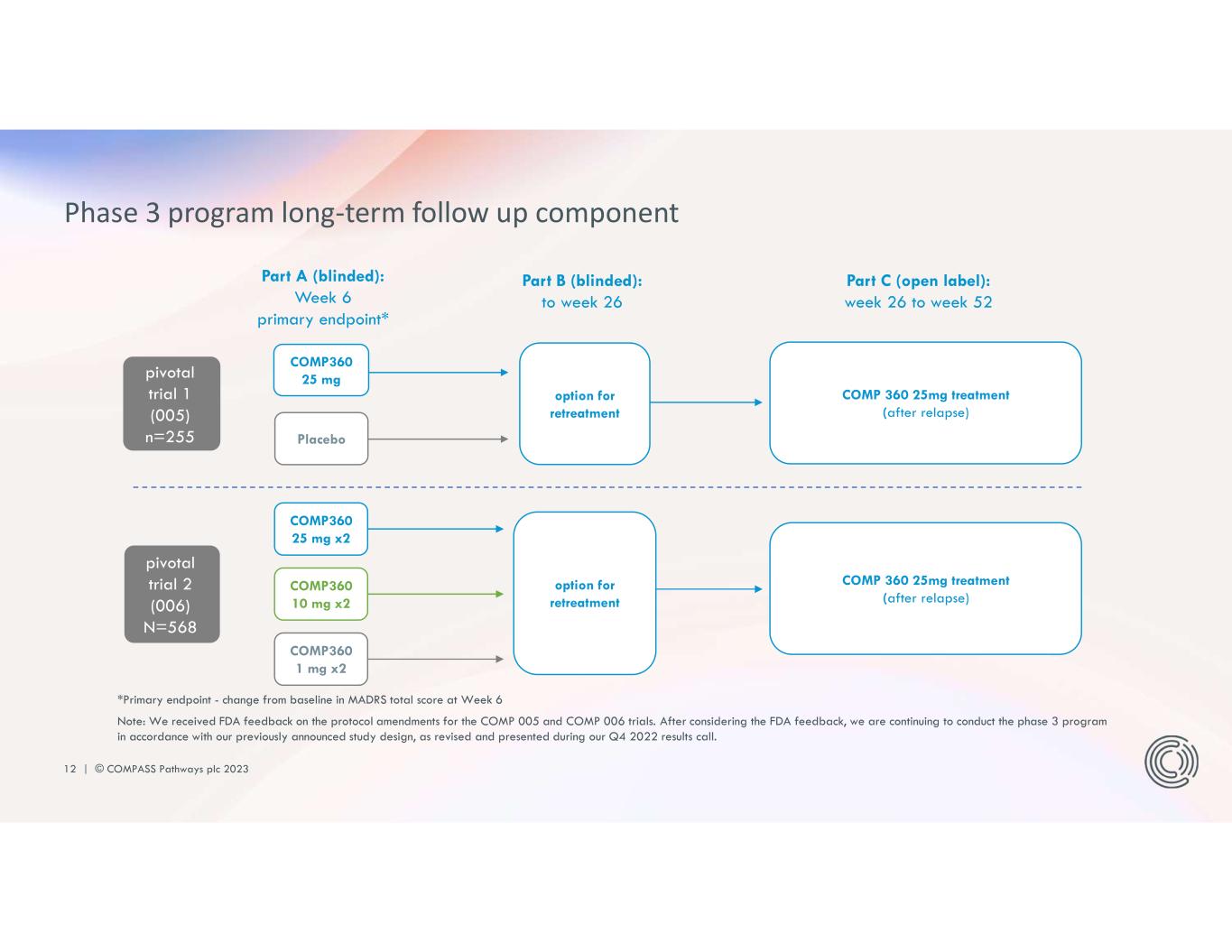 11 | © COMPASS Pathways plc 2023 Pivotal trial 1 Single dose monotherapy (COMP 005) COMP360 25 mg Placebo Pivotal trial 2 Fixed repeat dose monotherapy (COMP 006) COMP360 25 mg COMP 360 1 mg COMP360 25 mg COMP360 1 mg COMP360 10 mg COMP360 10 mg Randomisation = 2:1:1 n = 568 (284:142:142) Week 6 (Part A) Primary endpoint* Randomisation = 2:1 n = 255 (170:85) Week 3 Phase 3 program: Overview of ongoing pivotal trial designs Week 6 (Part A) Primary endpoint* Long-term follow-up Long-term follow-up The phase 3 program will be conducted across approx. 150 sites in 12 countries. Key secondary endpoints include change in MADRS at week 9, 6 weeks following second dose. The participant population (TRD definition and core inclusion/exclusion criteria) remains unchanged compared to Phase 2b *Primary endpoint - change from baseline in MADRS total score at Week 6 Top line primary analysis expected Summer 2024 Top line primary analysis expected mid 2025 Note: We received FDA feedback on the protocol amendments for the COMP 005 and COMP 006 trials. After considering the FDA feedback, we are continuing to conduct the phase 3 program in accordance with our previously announced study design, as revised and presented during our Q4 2022 results call.