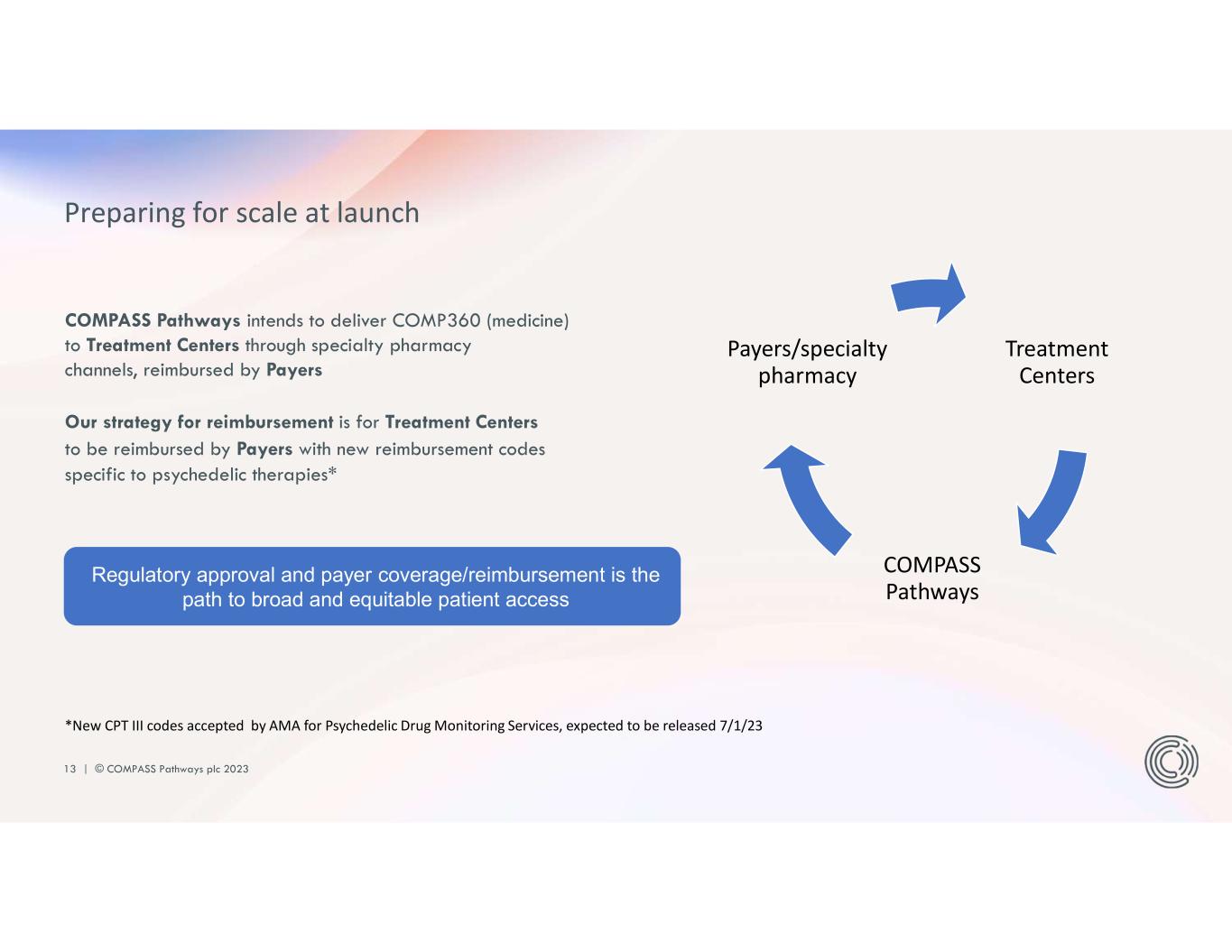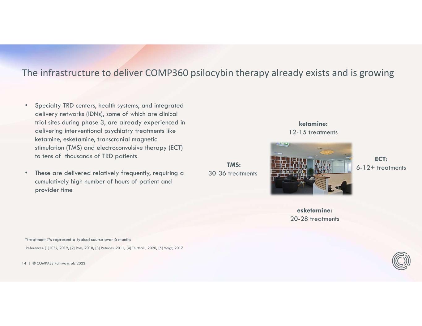 13 | © COMPASS Pathways plc 2023 Preparing for scale at launch Treatment Centers COMPASS Pathways Payers/specialty pharmacy COMPASS Pathways intends to deliver COMP360 (medicine) to Treatment Centers through specialty pharmacy channels, reimbursed by Payers Our strategy for reimbursement is for Treatment Centers to be reimbursed by Payers with new reimbursement codes specific to psychedelic therapies* *New CPT III codes accepted by AMA for Psychedelic Drug Monitoring Services, expected to be released 7/1/23 Regulatory approval and payer coverage/reimbursement is the path to broad and equitable patient access