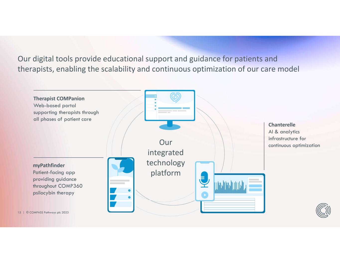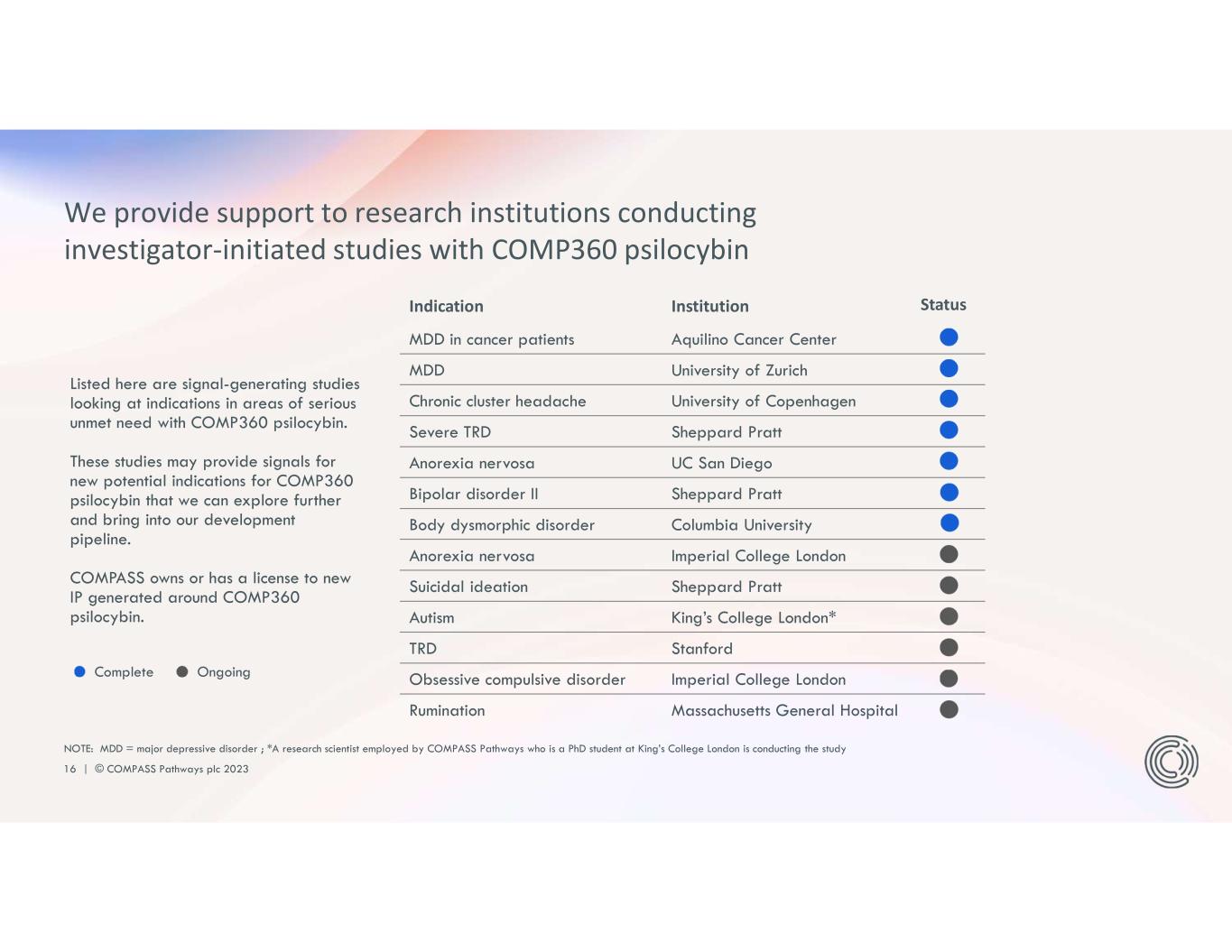 15 | © COMPASS Pathways plc 2023 Therapist COMPanion Web-based portal supporting therapists through all phases of patient care Chanterelle AI & analytics infrastructure for continuous optimization myPathfinder Patient-facing app providing guidance throughout COMP360 psilocybin therapy Our digital tools provide educational support and guidance for patients and therapists, enabling the scalability and continuous optimization of our care model Our integrated technology platform