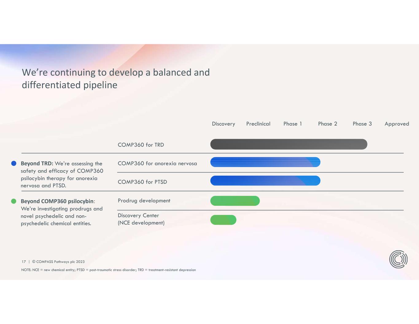 16 | © COMPASS Pathways plc 2023 Listed here are signal-generating studies looking at indications in areas of serious unmet need with COMP360 psilocybin. These studies may provide signals for new potential indications for COMP360 psilocybin that we can explore further and bring into our development pipeline. COMPASS owns or has a license to new IP generated around COMP360 psilocybin. Indication Institution Status MDD in cancer patients Aquilino Cancer Center MDD University of Zurich Chronic cluster headache University of Copenhagen Severe TRD Sheppard Pratt Anorexia nervosa UC San Diego Bipolar disorder II Sheppard Pratt Body dysmorphic disorder Columbia University Anorexia nervosa Imperial College London Suicidal ideation Sheppard Pratt Autism King’s College London* TRD Stanford Obsessive compulsive disorder Imperial College London Rumination Massachusetts General Hospital Complete Ongoing We provide support to research institutions conducting investigator-initiated studies with COMP360 psilocybin NOTE: MDD = major depressive disorder ; *A research scientist employed by COMPASS Pathways who is a PhD student at King’s College London is conducting the study
