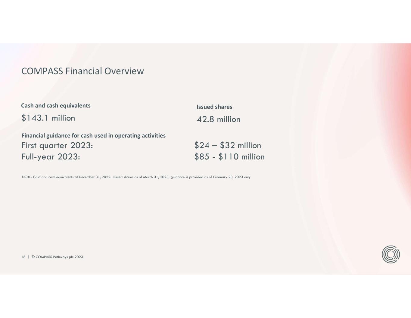 17 | © COMPASS Pathways plc 2023 Discovery Preclinical Phase 1 Phase 2 Phase 3 Approved COMP360 for TRD COMP360 for anorexia nervosa COMP360 for PTSD Prodrug development Discovery Center (NCE development) Beyond COMP360 psilocybin: We’re investigating prodrugs and novel psychedelic and non- psychedelic chemical entities. Beyond TRD: We’re assessing the safety and efficacy of COMP360 psilocybin therapy for anorexia nervosa and PTSD. We’re continuing to develop a balanced and differentiated pipeline NOTE: NCE = new chemical entity; PTSD = post-traumatic stress disorder; TRD = treatment-resistant depression