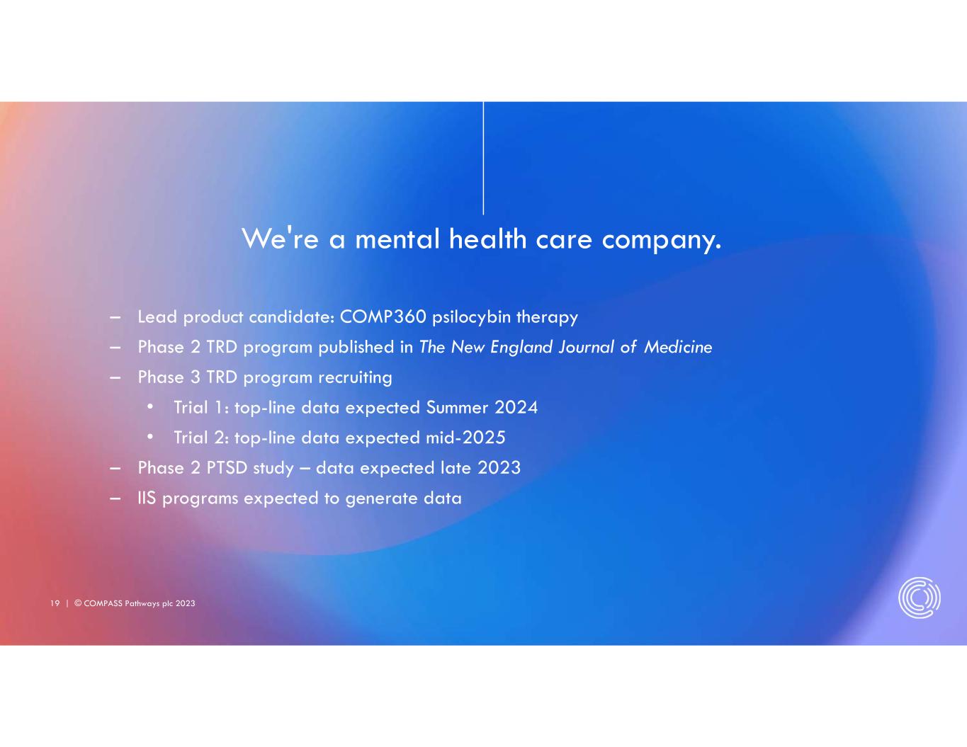 18 | © COMPASS Pathways plc 2023 Cash and cash equivalents $143.1 million COMPASS Financial Overview NOTE: Cash and cash equivalents at December 31, 2022. Issued shares as of March 31, 2023; guidance is provided as of February 28, 2023 only Issued shares 42.8 million Financial guidance for cash used in operating activities First quarter 2023: $24 – $32 million Full-year 2023: $85 - $110 million