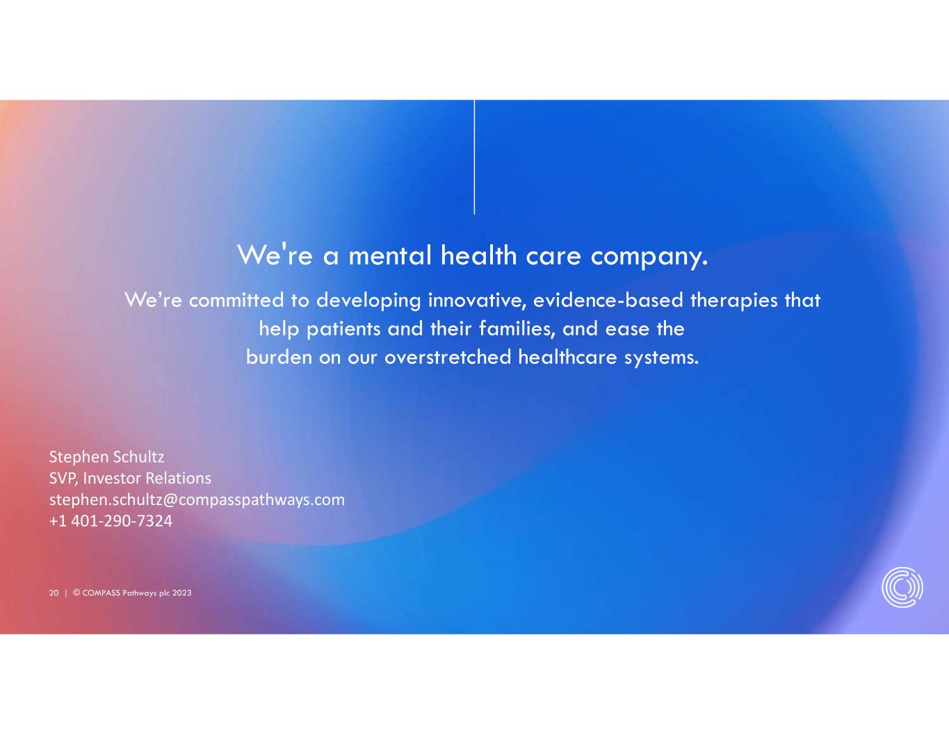 20 | © COMPASS Pathways plc 2023 We're a mental health care company. We’re committed to developing innovative, evidence-based therapies that help patients and their families, and ease the burden on our overstretched healthcare systems. Stephen Schultz SVP, Investor Relations stephen.schultz@compasspathways.com +1 401-290-7324