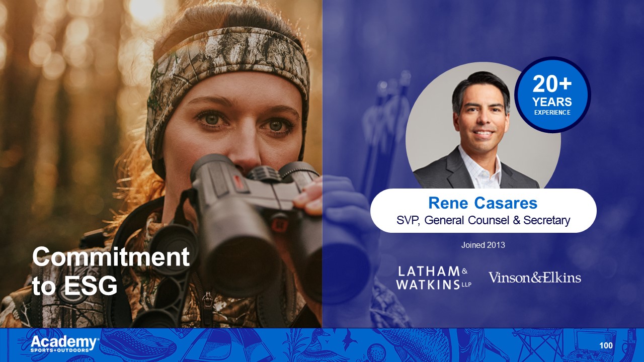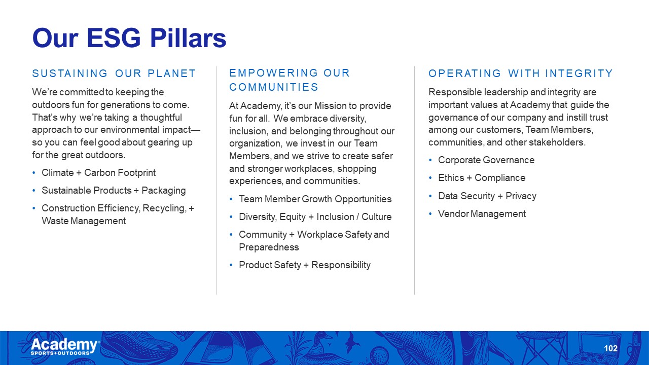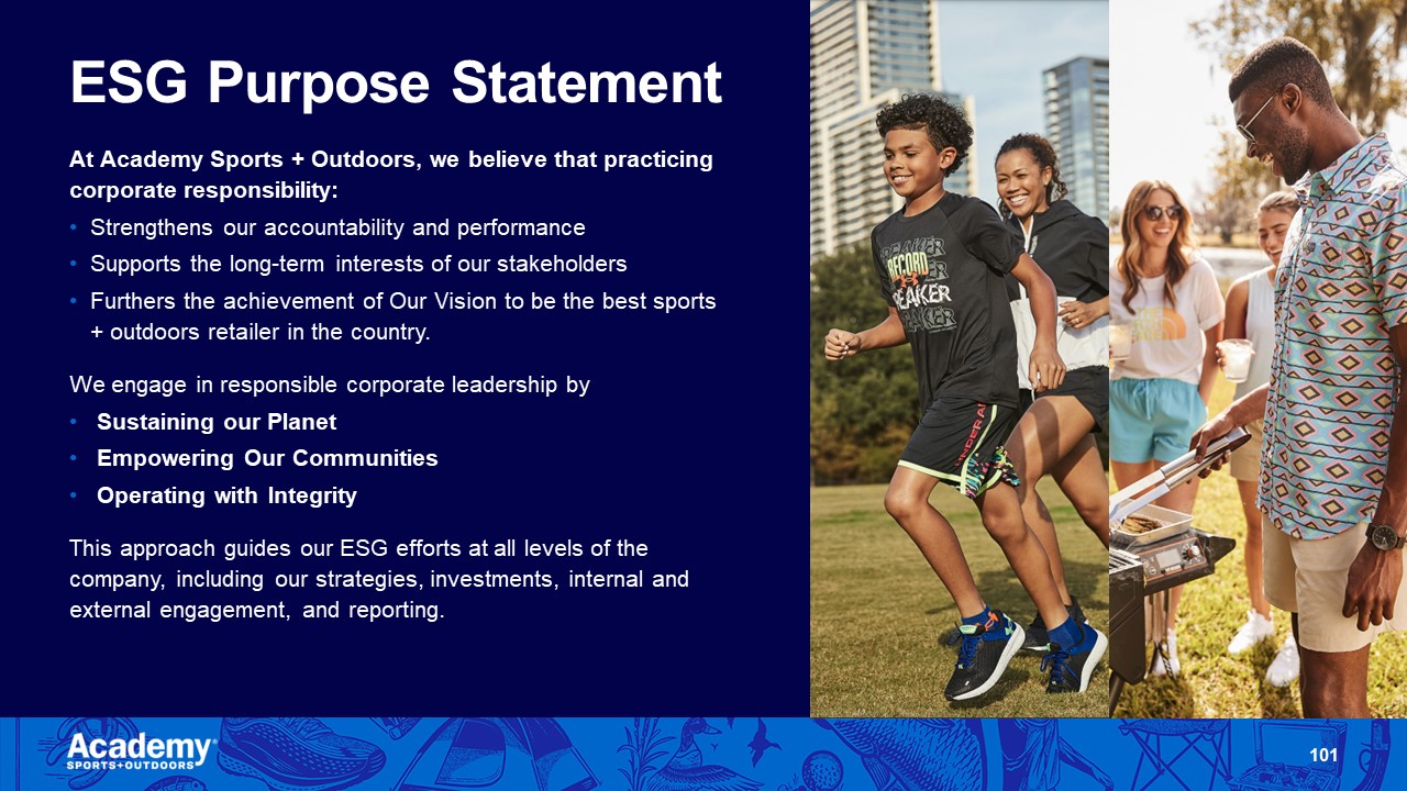 ESG Purpose Statement  At Academy Sports + Outdoors, we believe that practicing corporate responsibility:  Strengthens our accountability and performance  Supports the long-term interests of our stakeholders  Furthers the achievement of Our Vision to be the best sports + outdoors retailer in the country.  We engage in responsible corporate leadership by   Sustaining our Planet   Empowering Our Communities   Operating with Integrity  This approach guides our ESG efforts at all levels of the company, including our strategies, investments, internal and external engagement, and reporting.   101