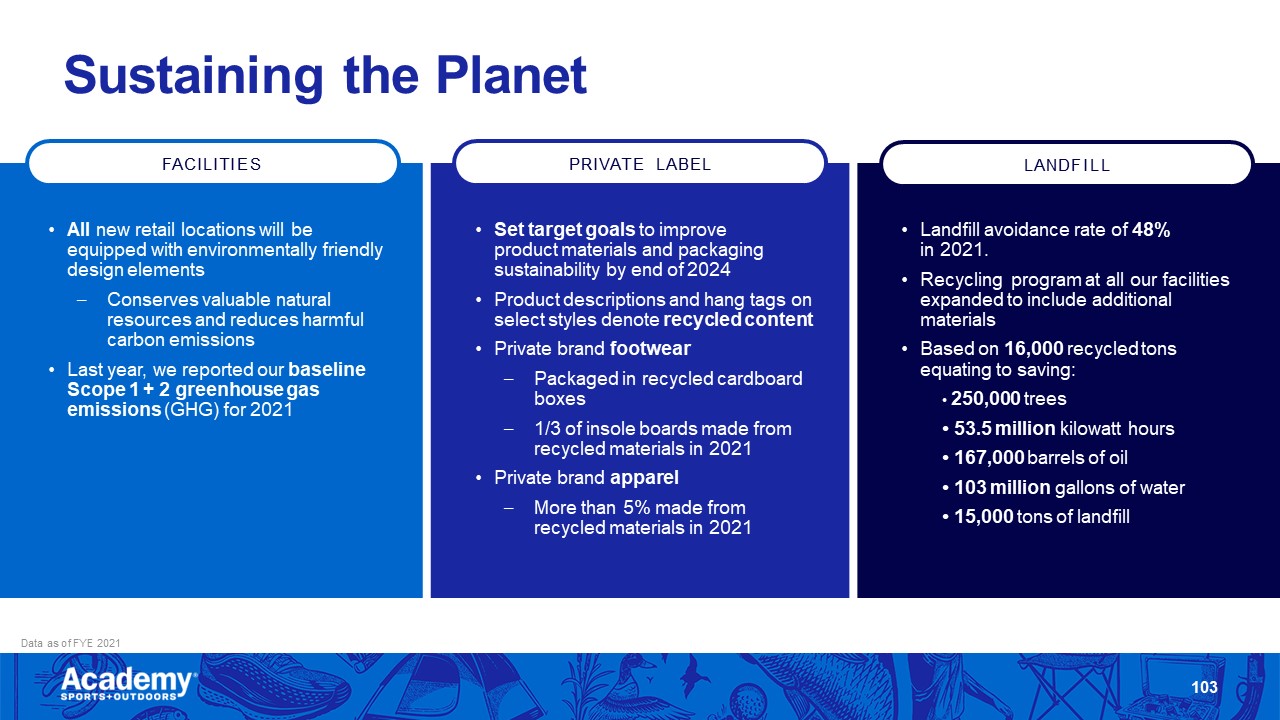 Sustaining the Planet  103  Data as of FYE 2021  All new retail locations will be equipped with environmentally friendly design elements   Conserves valuable natural resources and reduces harmful carbon emissions  Last year, we reported our baseline Scope 1 + 2 greenhouse gas emissions (GHG) for 2021  Set target goals to improve product materials and packaging sustainability by end of 2024  Product descriptions and hang tags on select styles denote recycled content  Private brand footwear   Packaged in recycled cardboard boxes  1/3 of insole boards made from recycled materials in 2021  Private brand apparel  More than 5% made from recycled materials in 2021  Landfill avoidance rate of 48% in 2021.   Recycling  program at all our facilities expanded to include additional materials  Based on 16,000 recycled tons equating to saving:           • 250,000 trees          • 53.5 million kilowatt hours          • 167,000 barrels of oil          • 103 million gallons of water          • 15,000 tons of landfill  Facilities  Private Label  Landfill