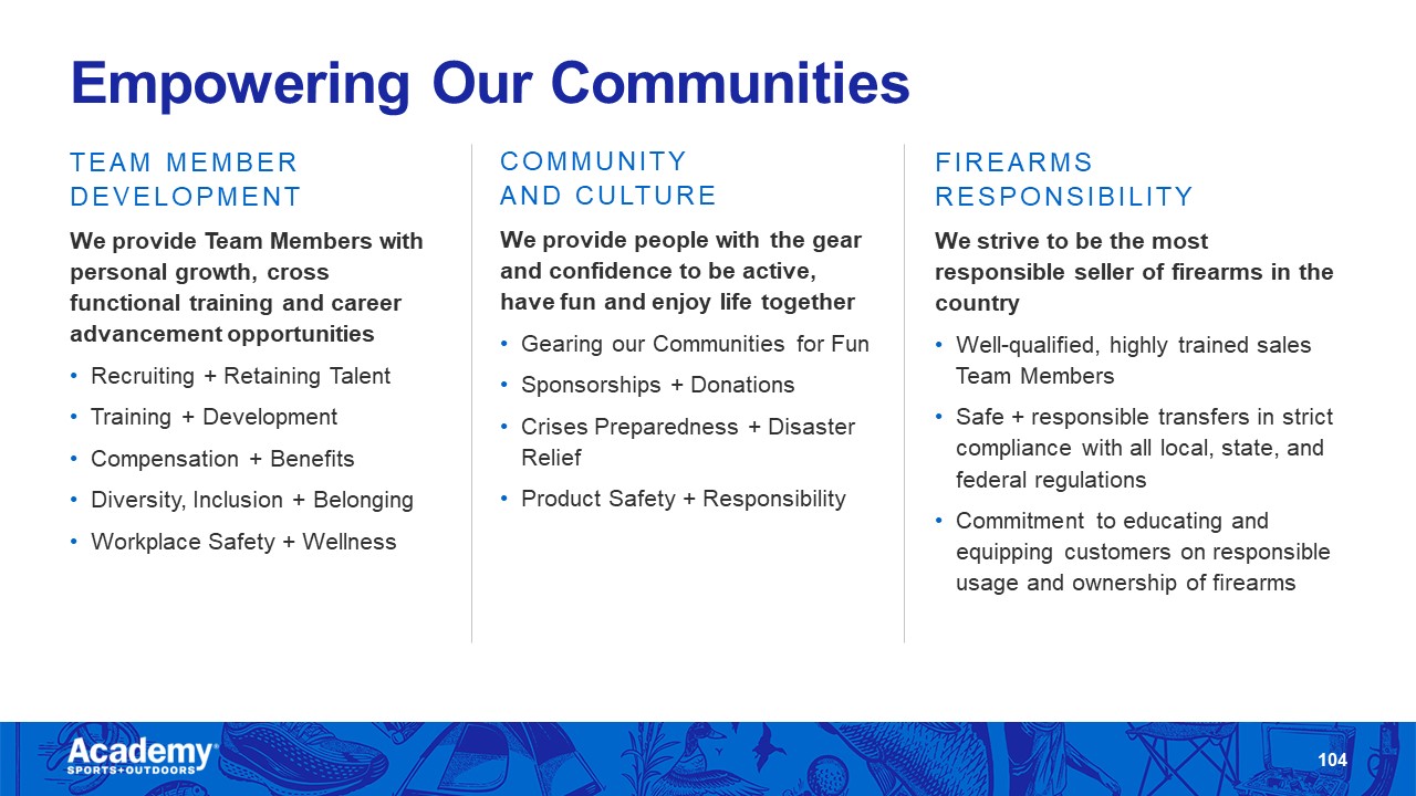 Empowering Our Communities  Team Member Development  We provide Team Members with personal growth, cross functional training and career advancement opportunities   Recruiting + Retaining Talent  Training + Development  Compensation + Benefits  Diversity, Inclusion + Belonging  Workplace Safety + Wellness  104  Community and Culture  We provide people with the gear and confidence to be active, have fun and enjoy life together  Gearing our Communities for Fun  Sponsorships + Donations  Crises Preparedness + Disaster Relief  Product Safety + Responsibility  Firearms Responsibility  We strive to be the most responsible seller of firearms in the country  Well-qualified, highly trained sales Team Members  Safe + responsible transfers in strict compliance with all local, state, and federal regulations  Commitment to educating and equipping customers on responsible usage and ownership of firearms