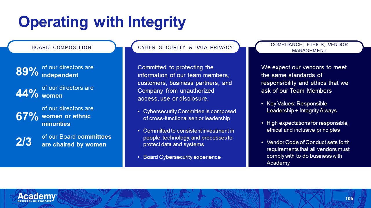 Operating with Integrity  105  of our directors are independent  of our directors are women  of our directors are women or ethnic minorities  of our Board committees are chaired by women  Committed to protecting the information of our team members, customers, business partners, and Company from unauthorized access, use or disclosure.   Cybersecurity Committee is composed of cross-functional senior leadership  Committed to consistent investment in people, technology, and processes to protect data and systems  Board Cybersecurity experience  We expect our vendors to meet the same standards of responsibility and ethics that we ask of our Team Members  Key Values: Responsible Leadership + Integrity Always  High expectations for responsible, ethical and inclusive principles  Vendor Code of Conduct sets forth requirements that all vendors must comply with to do business with Academy   Board Composition  Cyber Security & Data Privacy  Compliance, Ethics, Vendor Management  89%  44%  67%  2/3