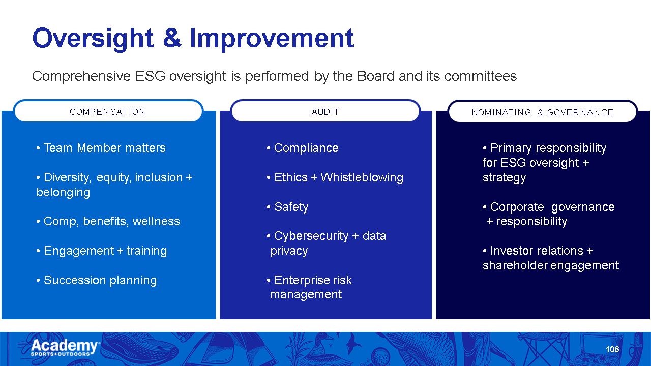 Oversight & Improvement  Comprehensive ESG oversight is performed by the Board and its committees  106  • Team Member matters  • Diversity, equity, inclusion + belonging  • Comp, benefits, wellness  • Engagement + training  • Succession planning   Compliance   Ethics + Whistleblowing   Safety   Cybersecurity + data   privacy   Enterprise risk   management   Primary responsibility for ESG oversight + strategy   Corporate  governance  + responsibility   Investor relations + shareholder engagement
