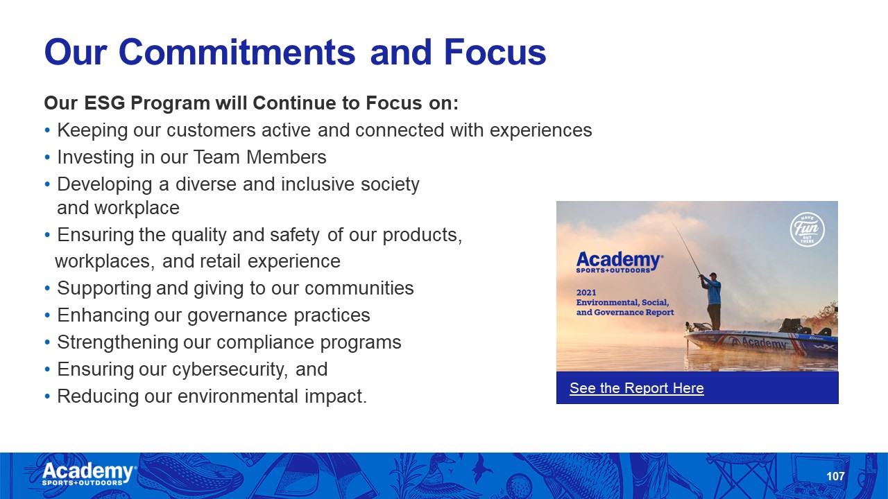 Our Commitments and Focus  Our ESG Program will Continue to Focus on:  Keeping our customers active and connected with experiences  Investing in our Team Members  Developing a diverse and inclusive society and workplace  Ensuring the quality and safety of our products,    workplaces, and retail experience  Supporting and giving to our communities  Enhancing our governance practices  Strengthening our compliance programs  Ensuring our cybersecurity, and  Reducing our environmental impact.   107  See the Report Here
