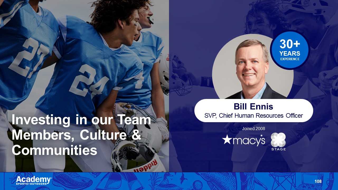 Investing in our Team Members, Culture &Communities   108  Bill EnnisSVP, Chief Human Resources Officer  30+  YEARSEXPERIENCE  Joined 2008