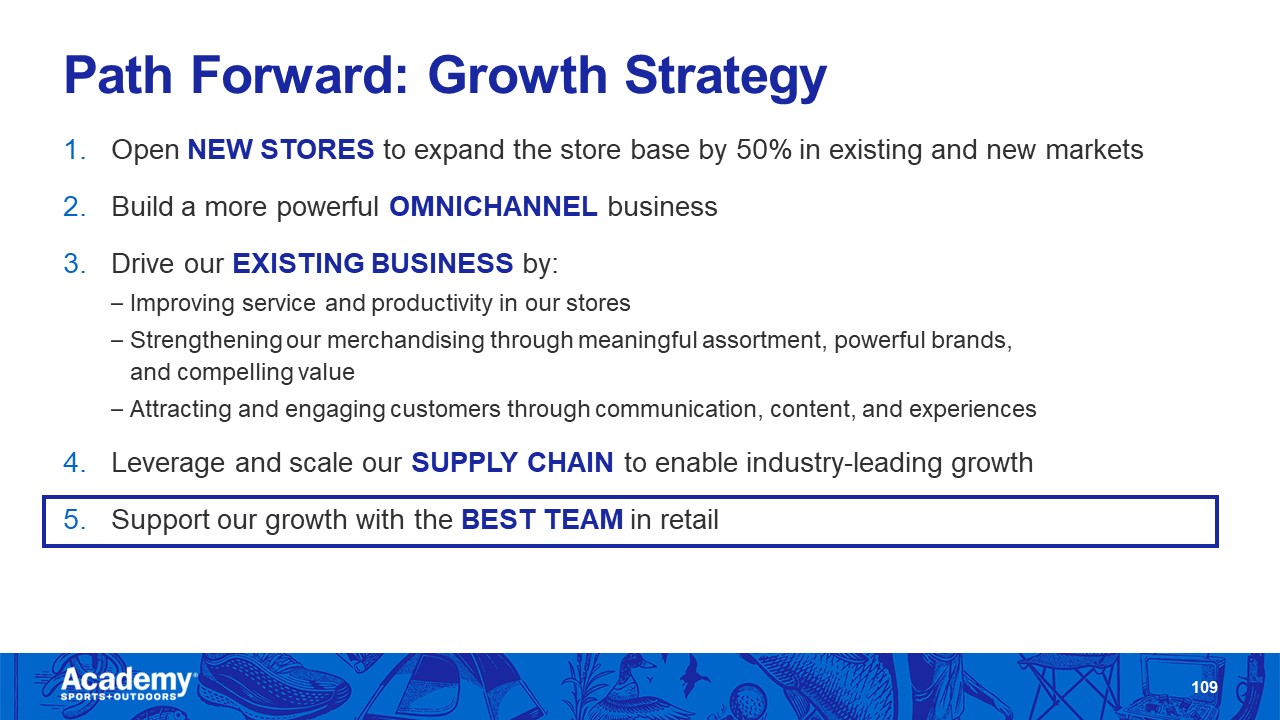 Path Forward: Growth Strategy  Open NEW STORES to expand the store base by 50% in existing and new markets  Build a more powerful OMNICHANNEL business  Drive our EXISTING BUSINESS by:  Improving service and productivity in our stores  Strengthening our merchandising through meaningful assortment, powerful brands, and compelling value   Attracting and engaging customers through communication, content, and experiences  Leverage and scale our SUPPLY CHAIN to enable industry-leading growth  Support our growth with the BEST TEAM in retail  109