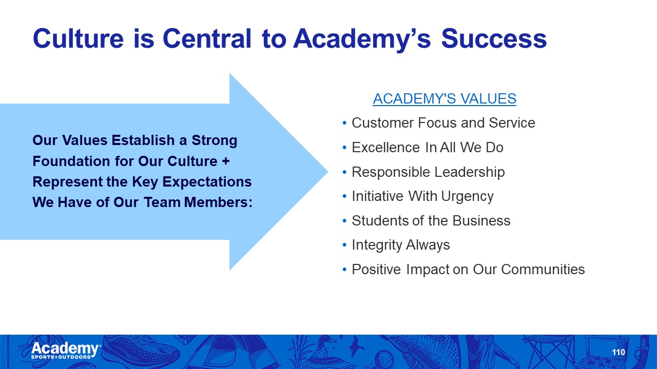 Culture is Central to Academy’s Success  Our Values Establish a Strong Foundation for Our Culture +   Represent the Key Expectations   We Have of Our Team Members:  110          ACADEMY'S VALUES  Customer Focus and Service  Excellence In All We Do  Responsible Leadership  Initiative With Urgency  Students of the Business  Integrity Always  Positive Impact on Our Communities