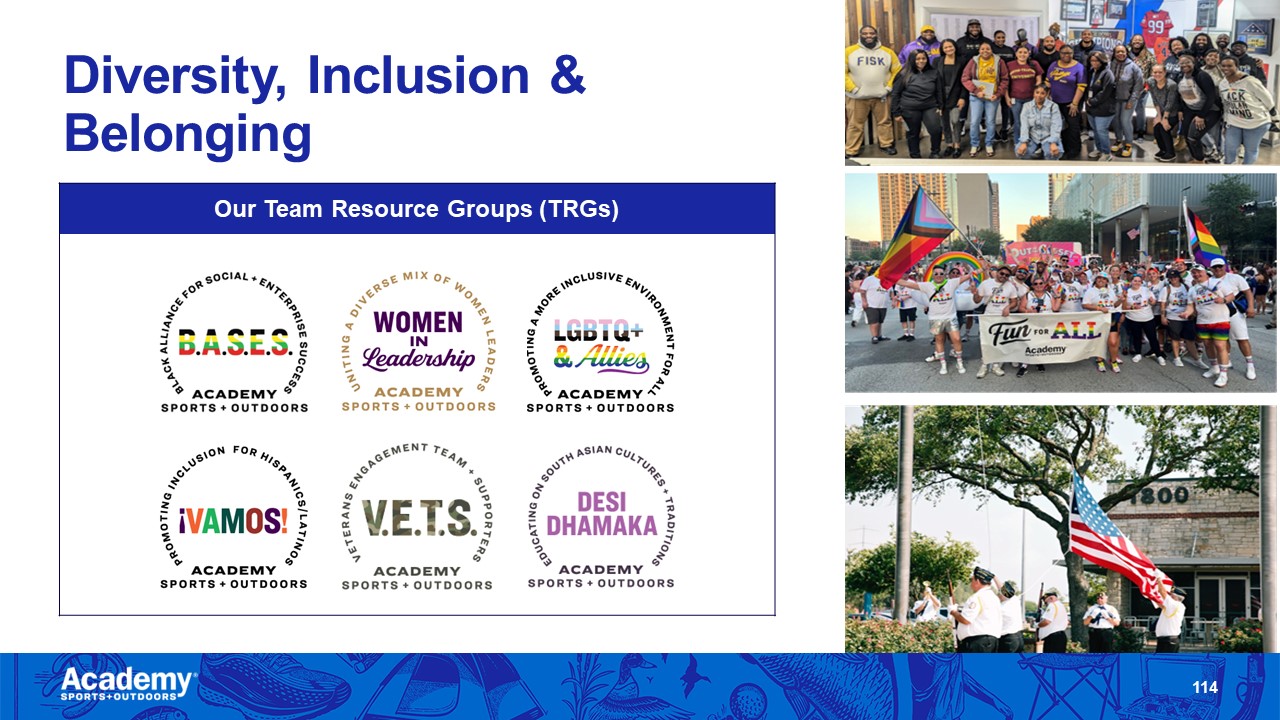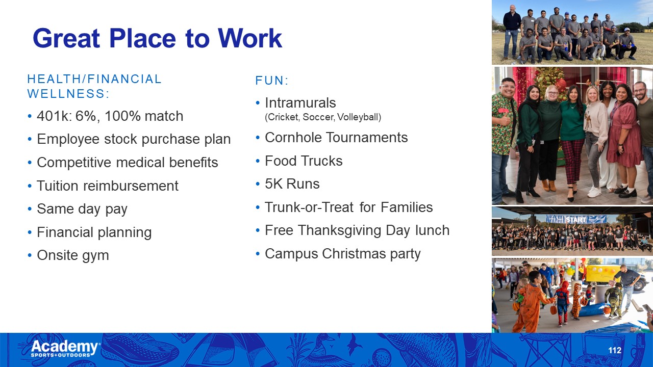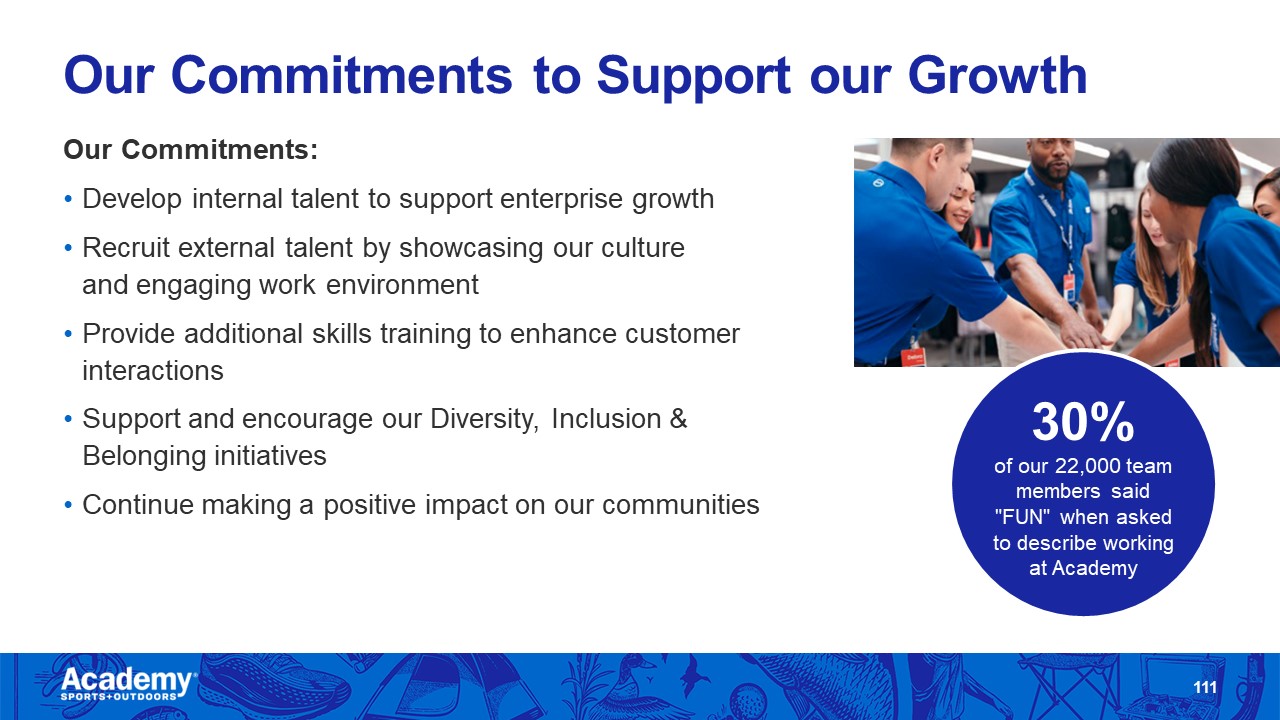 Our Commitments to Support our Growth  Our Commitments:  Develop internal talent to support enterprise growth  Recruit external talent by showcasing our culture and engaging work environment  Provide additional skills training to enhance customer interactions  Support and encourage our Diversity, Inclusion & Belonging initiatives  Continue making a positive impact on our communities  111  30%of our 22,000 team members said "FUN" when asked to describe working at Academy